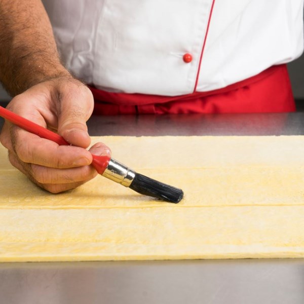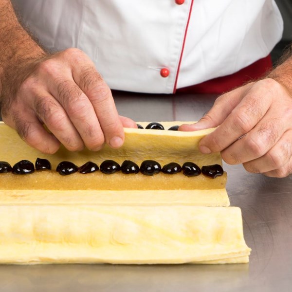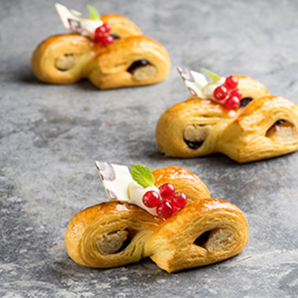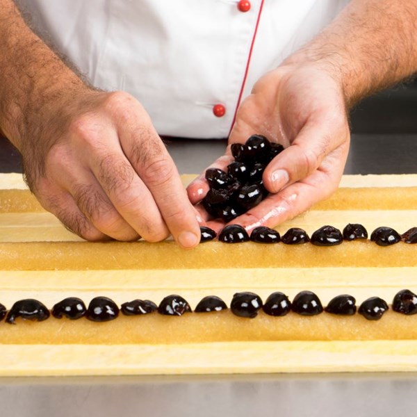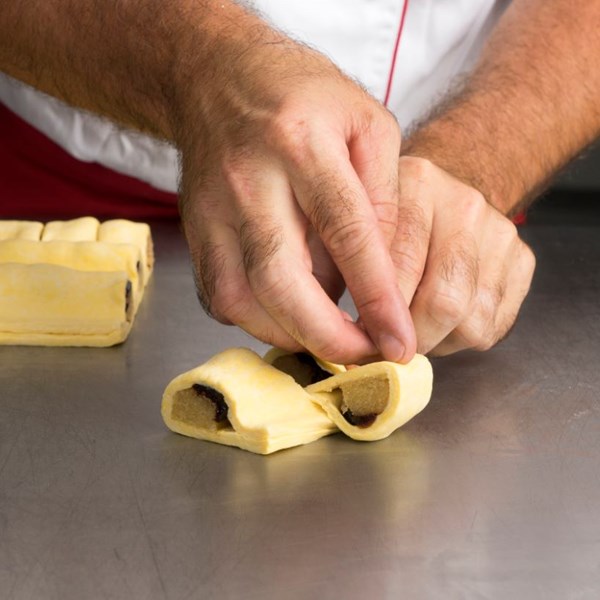 Roll out the croissant dough to a thickness of 2 mm and cut strips of 48 cm wide and 12 cm long. Moist the dough slightly. Place the almond paste on the dough and divide the amarena cherries on top. Fold one side of the dough over the filling to the other side and press firmly. Now cut stripes of 9 cm. Afterwards freeze them lightly. Remove the products from the freezer cut them 2 times and fold the middle part to the other side and press firmly (each part 3 cm, see photo 3). Place the breads on a baking sheet and let them rise for 60 minutes. Decorate the breads after baking them.