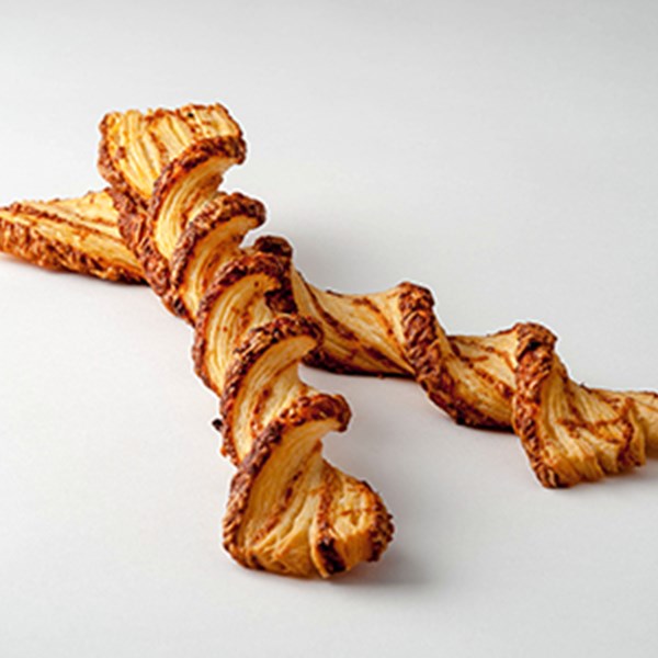 Roll out the pastry dough to 9 mm, 25 cm wide. Imagine the dough is in three sections and add decoration to the middle section (lightly moisten), fold 1 section on top and add decoration. Fold the final dough section and turn the dough 90 degrees. Step-by-step, roll out to 15 mm. Slightly moisten the top and generously decorate. Keep rolling out to 13 mm and turn it over (underside is then on top) then generously decorate this side. Now roll the dough to a thickness of 10 to 9 mm (width +/- 25 cm and cut strips of +/- 1 cm) with a sharp knife. Twist these strips 2 x and initially lay them close to each other and then put into the freezer for a while. This reduces the tension in the dough and the sticks will stay nicely twisted. As desired remove, defrost and allow to rise for about 50 min.