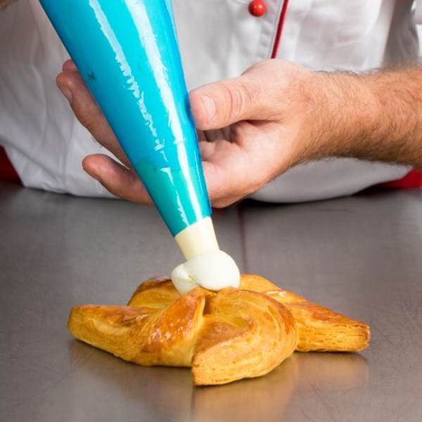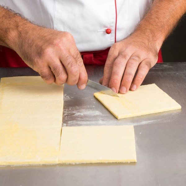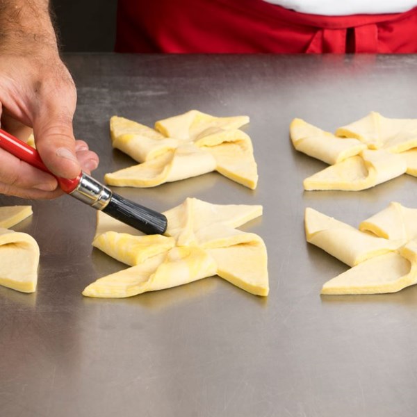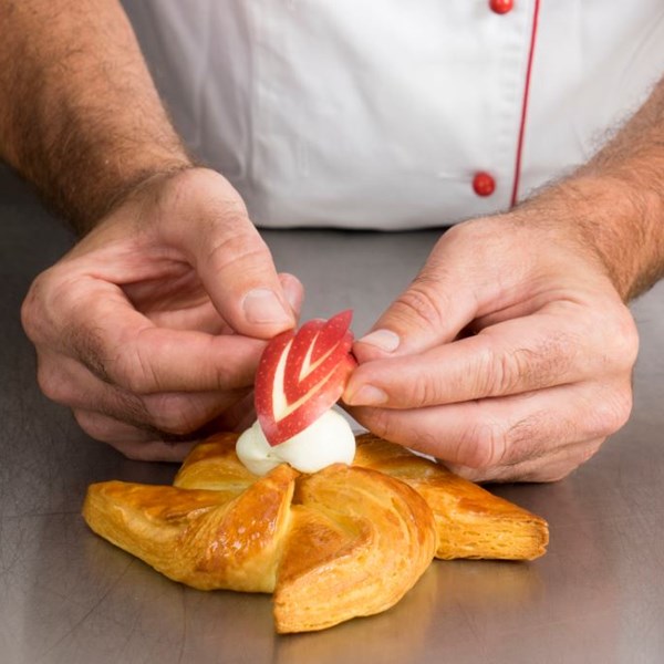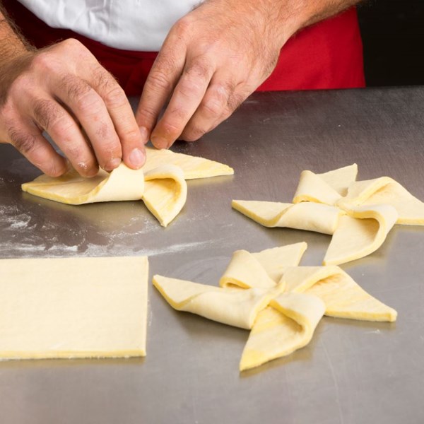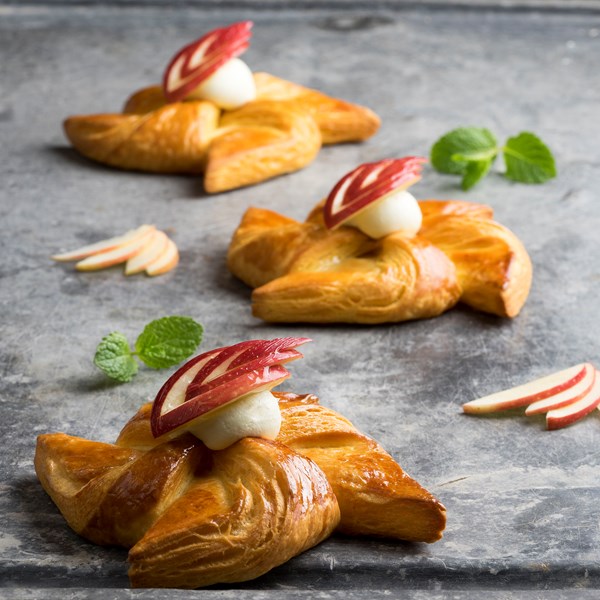 Roll out the croissant dough to a tickness of 2,5 mm and cut squares of 12 cm by 12 cm. Cut every corner of the square and fold them inwards and press firmly (see picture 2). Brush al the stars with egg and let them rise for 60 minutes. Decorat the stars after baking as desired, for example with the apple mousse