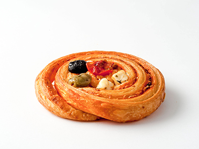 Het deeg uitrollen tot een dikte van 2,5 à 2,75 mm en 60 cm breed. De plak bestrijken met een gearomatiseerde olie (knoflook, peper of chilikruiden). Hierna de plak bestrooien met geraspte oude kaas en deze lichtjes aandrukken. Eventueel aanvullen met stukjes gehakte olijven, tomaatstukjes en/of mozzarella. Lichtjes oprollen. Op 3 cm breed afsnijden en op de bakplaat 60 min laten rijzen. Voor het bakken voorzien van wat decoratie (half cherrytomaatje, halve groene en zwarte olijven en blokjes feta).
