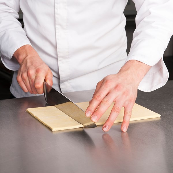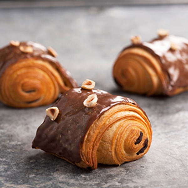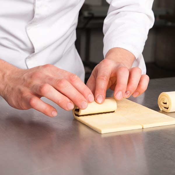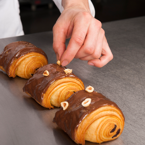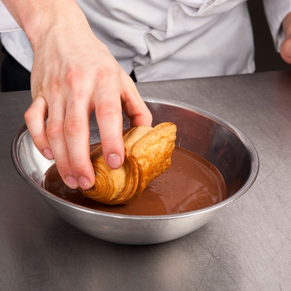 Den Croissantteig 3 mm dick ausrollen. Den Teig in 8 x 19 cm große Stücke schneiden. Bis zum Gefrierpunkt abkühlen. Das erste backfeste Schokoladenstäbchen an den ersten Einschlag legen und das zweite Stäbchen an den zweiten. Den Rest des Teigs schön rund aufrollen. Die Naht sollte unten in der Mitte liegen; vorsichtig andrücken. Die Schokocroissants im Gärschrank bei einer Temperatur von 28 °C und einer Feuchtigkeit von maximal 70 % schön locker werden lassen. Für extra Glanz die Croissants vor dem Backen mit Eigelb und 10 % Vollmilch besprühen. Nach dem Abbacken und Abkühlen die Oberseite in Schokolade tauchen und nach Wunsch dekorieren.