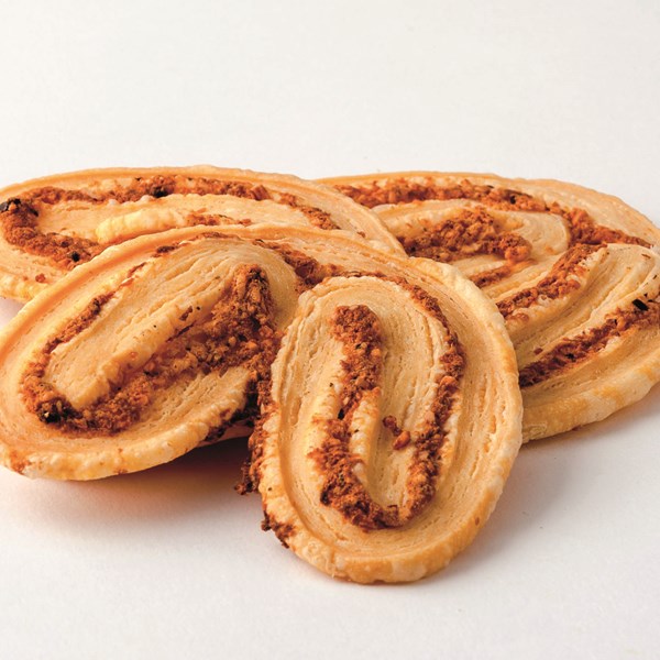 Die Füllung auftragen, ordentlich verteilen und verstreichen. Für Käseblätterteiggebäck die Seiten zweimal nach innen falten, Platz zwischen den zwei Streifen lassen und diese dann aufeinanderfalten. Die Streifen zum Steifwerdenlassen in den Gefrierschrank legen. So können Sie sie in schmale Kekse schneiden (4 bis 5 mm). Danach 18 bis 22 Minuten bei 200 °C auf Backpapier backen. Gegebenenfalls bei 100 °C im Ofen oder Trockner nachtrocknen lassen.