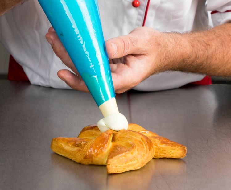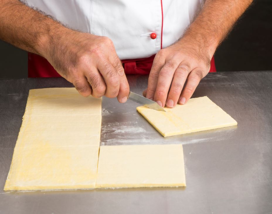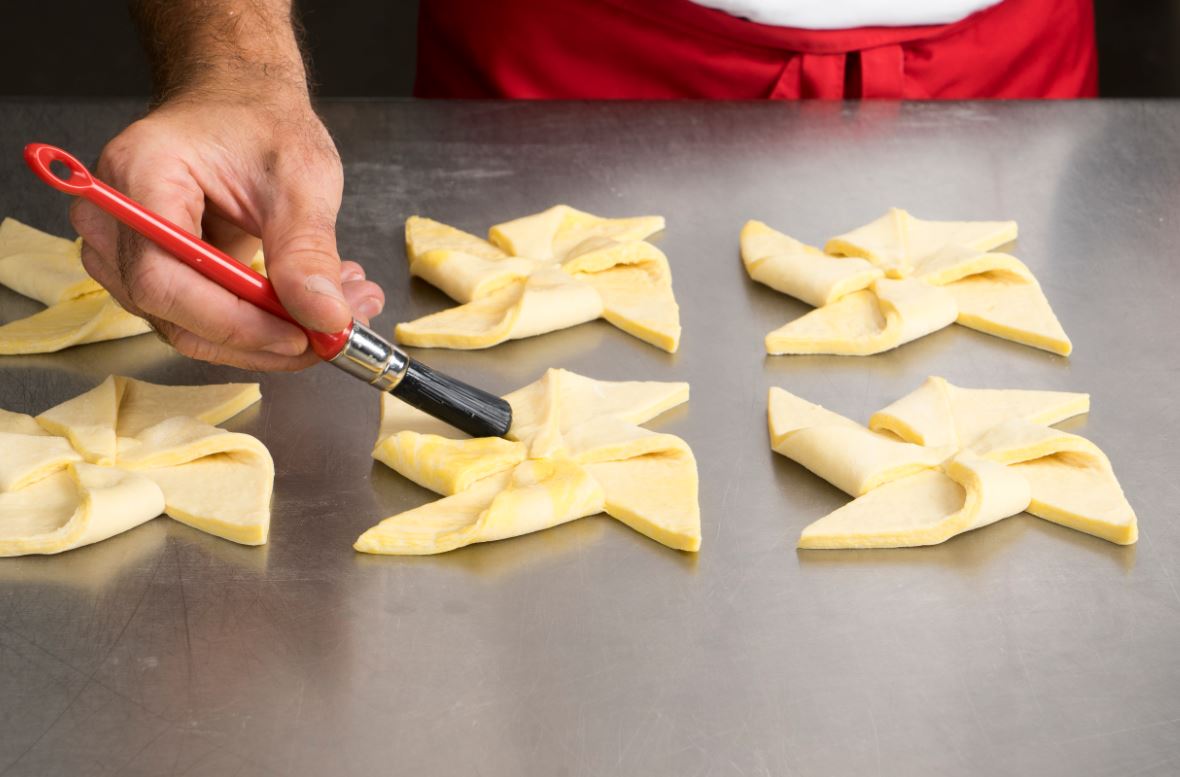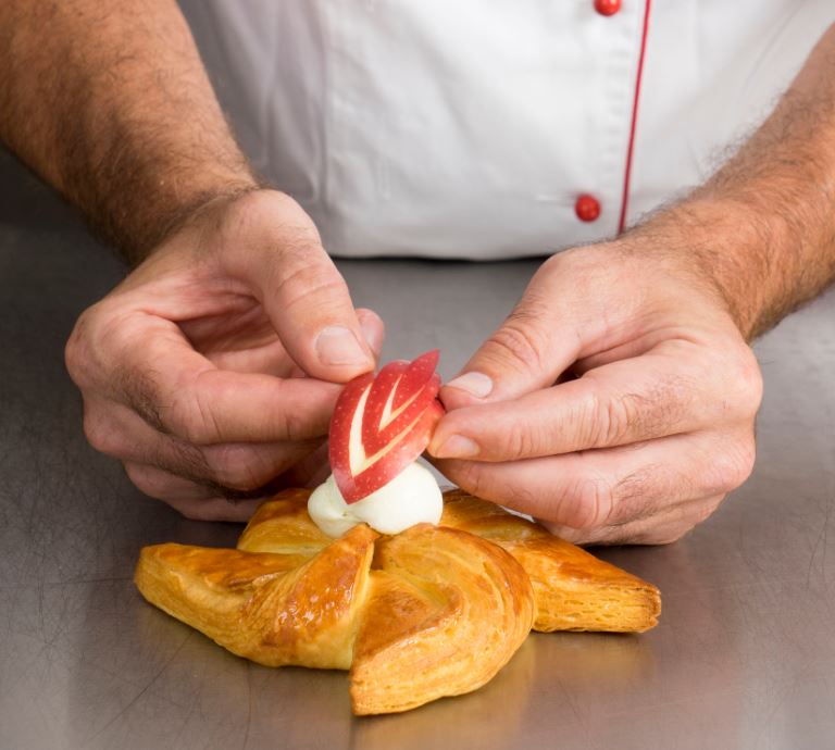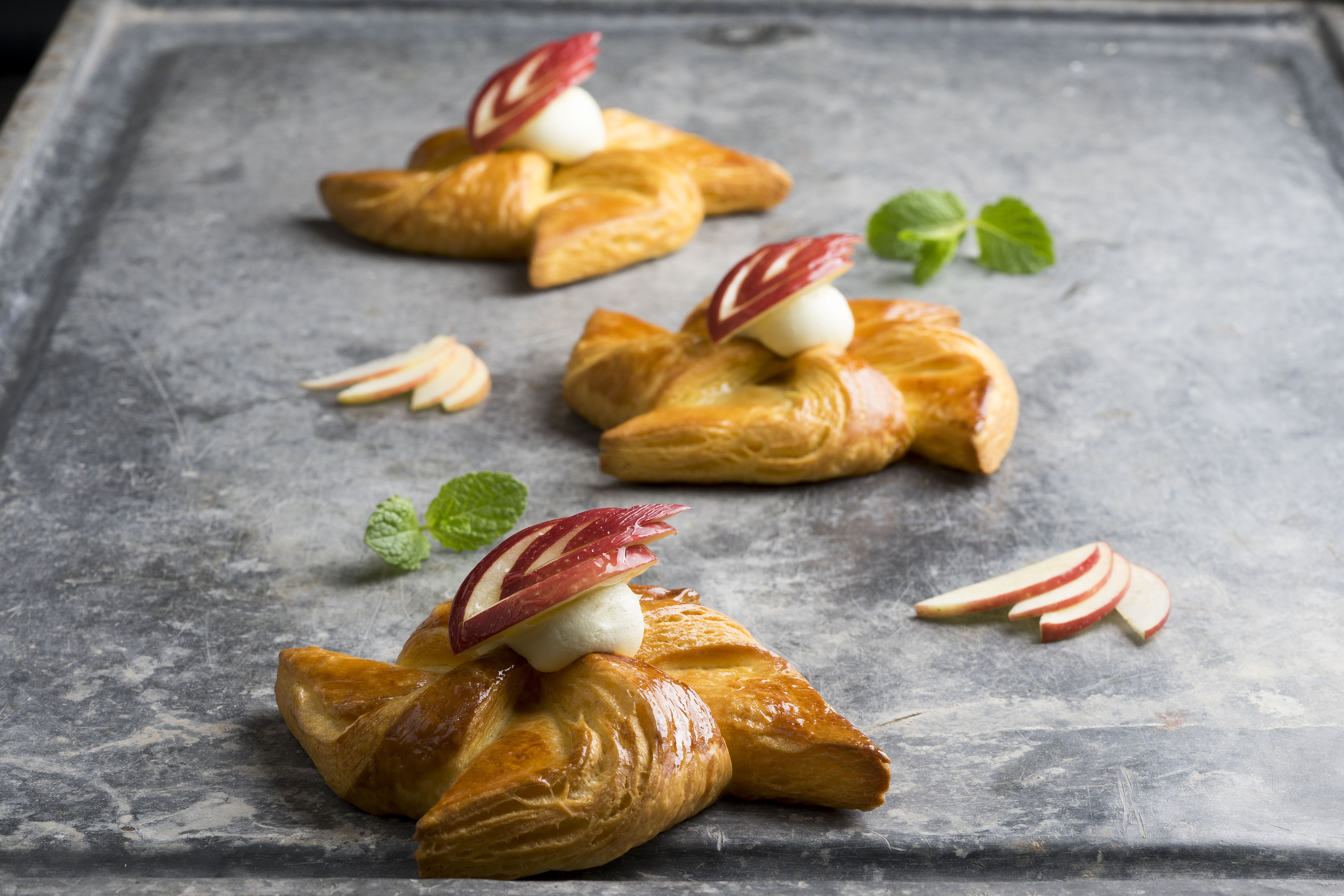 Den Blätterteig 2,5 mm dick ausrollen. Ein Viereck von 12 x 12 cm ausschneiden. Dann alle vier Spitzen 3 cm tief diagonal zur Mitte hin einschneiden. Danach die vier Ecken nach innen umklappen und fest andrücken. Alle Sterne mit Ei bestreichen. Dann 60 Minuten aufgehen lassen und fertigbacken. Den Stern nach Geschmack dekorieren, zum Beispiel Apfelmus aufspritzen.