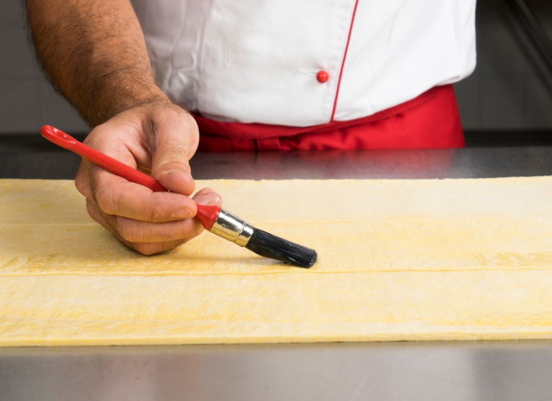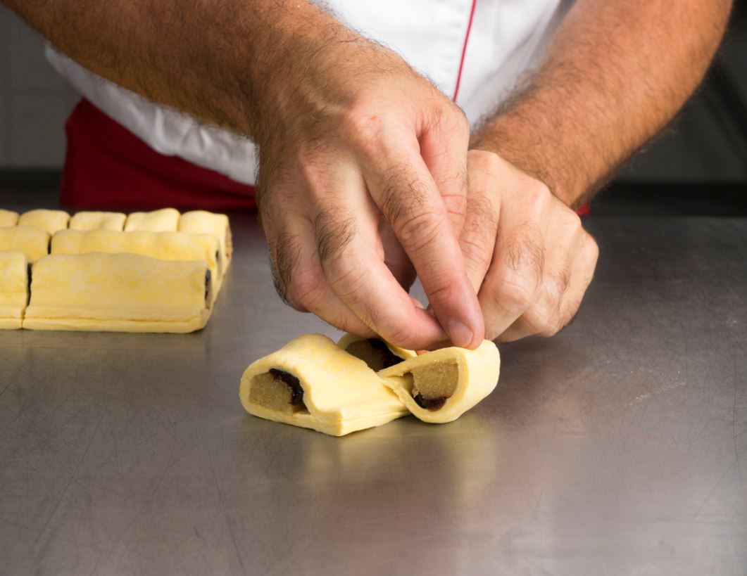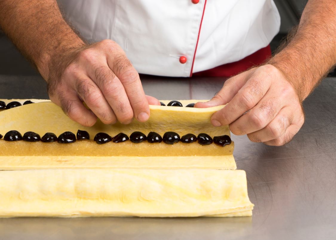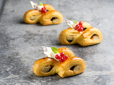 Roll out the croissant dough to a thickness of 2 mm and cut strips of 48 cm wide and 12 cm long. Moist the dough slightly. Place the almond paste on the dough and divide the amarena cherries on top. Fold one side of the dough over the filling to the other side and press firmly. Now cut stripes of 9 cm. Afterwards freeze them lightly. Remove the products from the freezer cut them 2 times and fold the middle part to the other side and press firmly (each part 3 cm, see photo 3). Place the breads on a baking sheet and let them rise for 60 minutes. Decorate the breads after baking them.