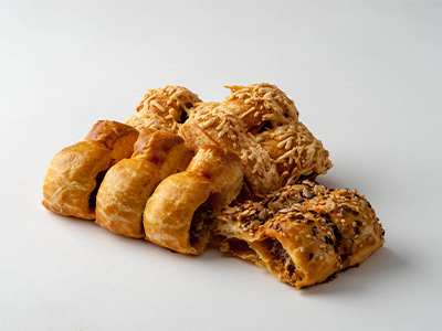 Then roll out the dough to 1.75 to 2 mm and cut strips 15 cm wide. Pipe the meat filling onto it. Fold and brush with egg. When you brush the dough with egg a second time, press the strips with a blunt scraper every 3 cm (not quite through). You can also add grated old cheese, seed mixes and/or spicy breadcrumbs. Note: Products must have had sufficient rest before you iron and bake them the second time (60 min. rest).