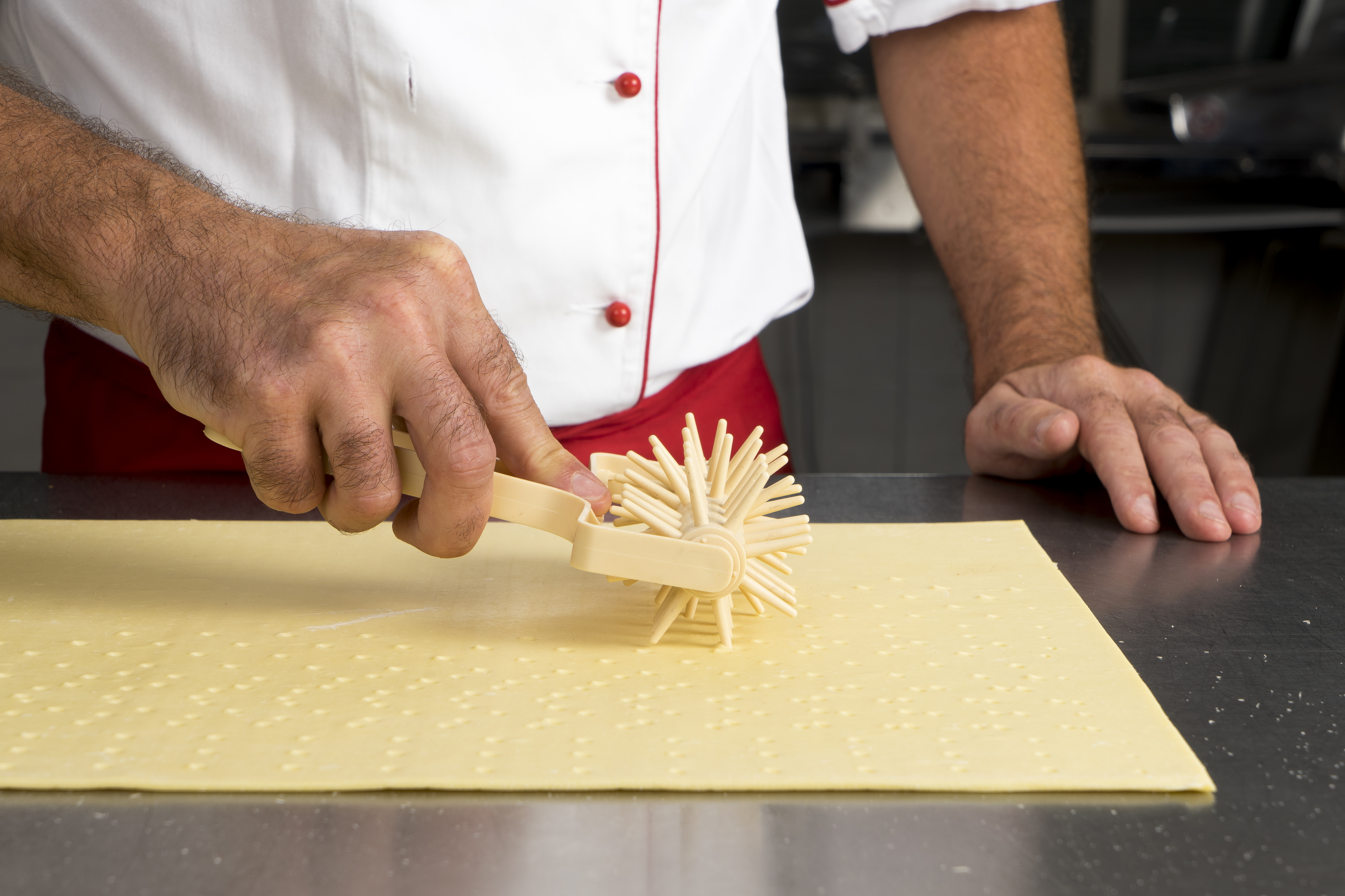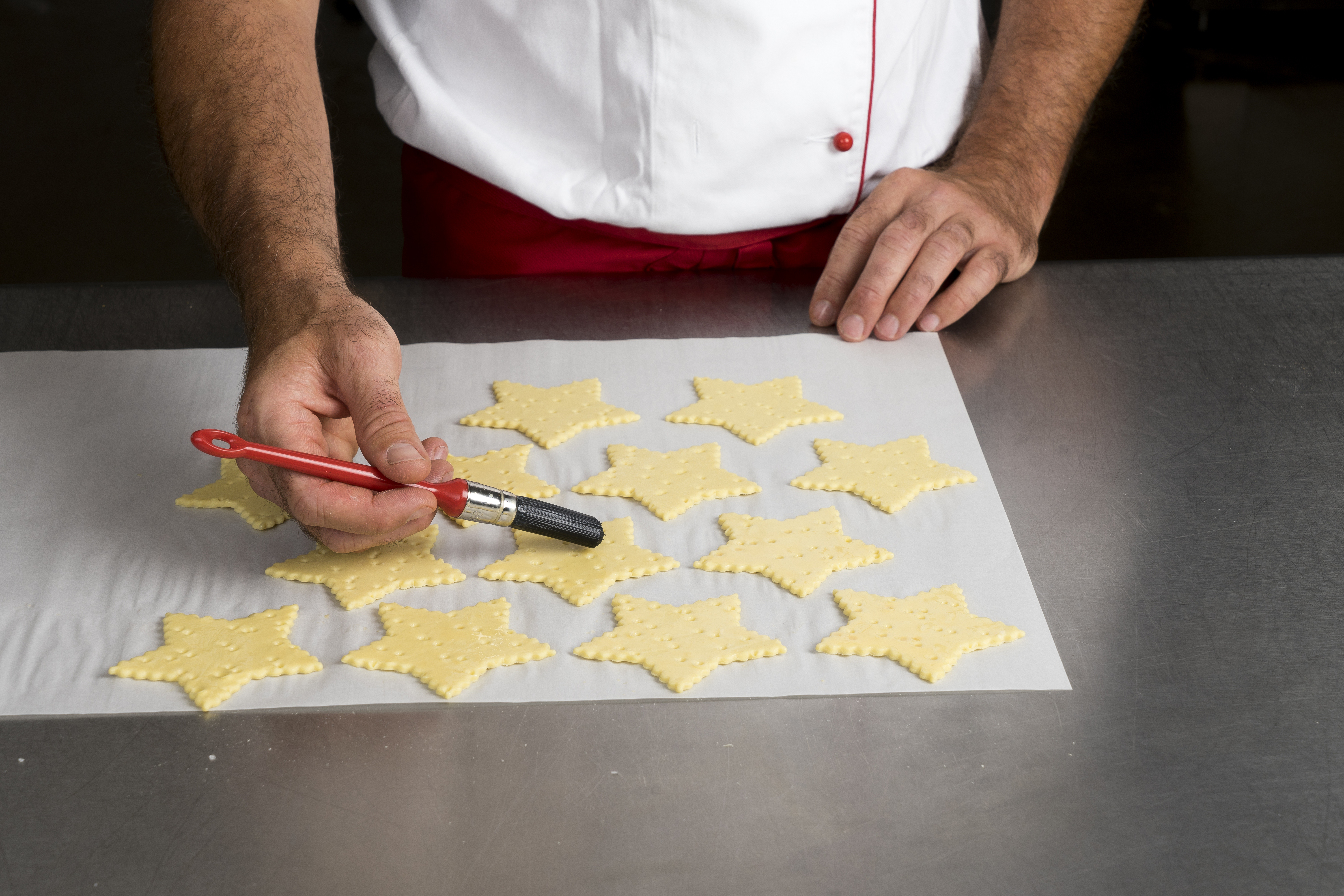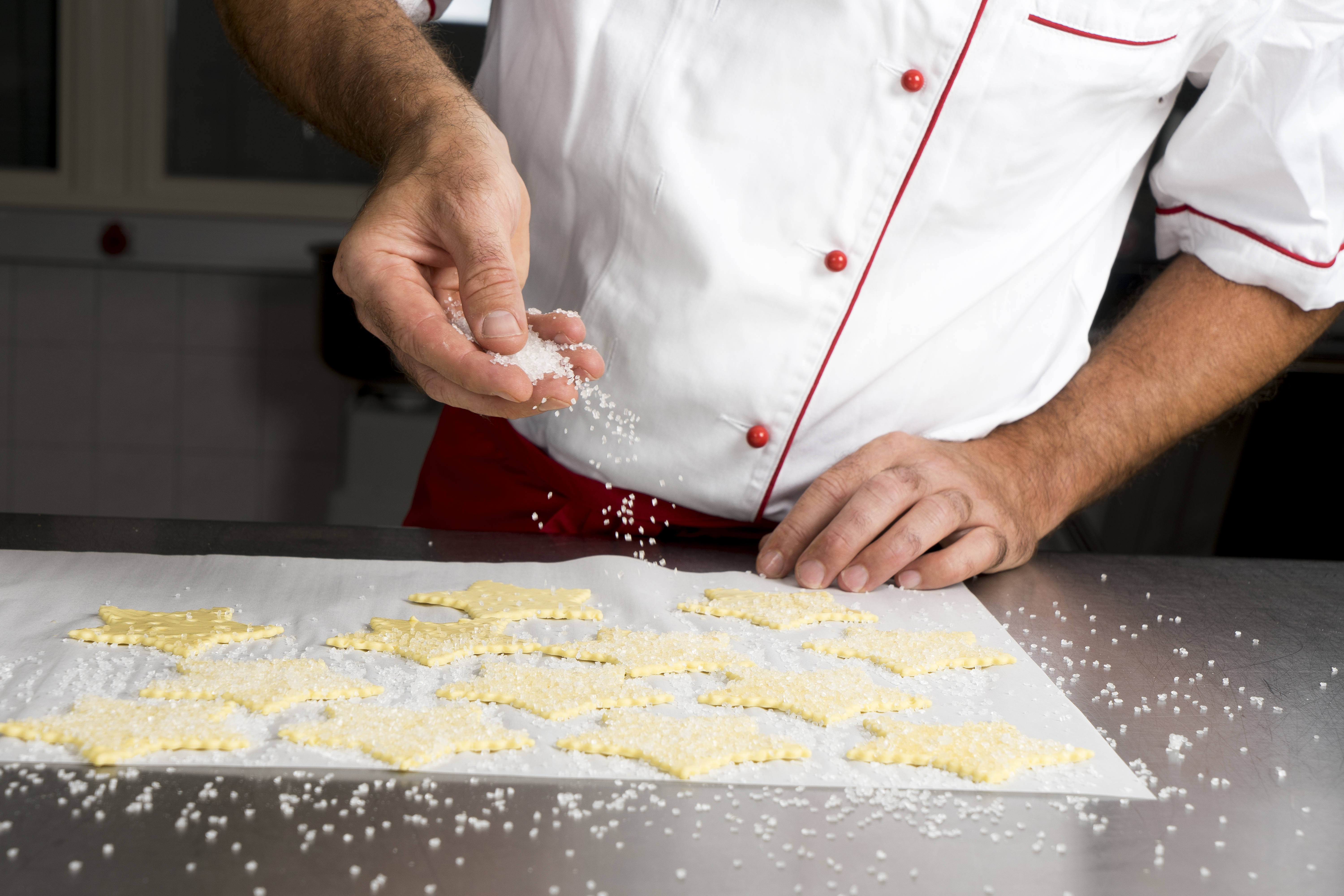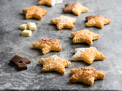 Roll out the puff pastry to a thickness of 1,5 to 1,75 mm. Place the dough on a baking sheet, prick and let rest for one hour in a cold place. Now cut the shapes as desired. Brush the shapes with egg and spread the suger on top. After baking, decorate the biscuits with chocolate.