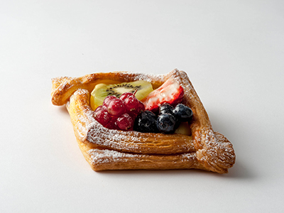 Vouw het plakje bladerdeeg diagonaal dubbel en snijd langs de zijde in. Blijf hierbij 5 mm van de kant af en 1 cm uit de punt. Vouw hierna het dubbel gevouwen plakje terug en vouw de ingesneden stukken richting overzijde. Op deze manier ontstaat er een strikje. Druk het deeg flink aan op het punt waar het kruist zodat het niet loslaat tijdens het bakken. Bestrijk de producten met ei, laat het vervolgens 60 minuten rijzen en licht stomen.