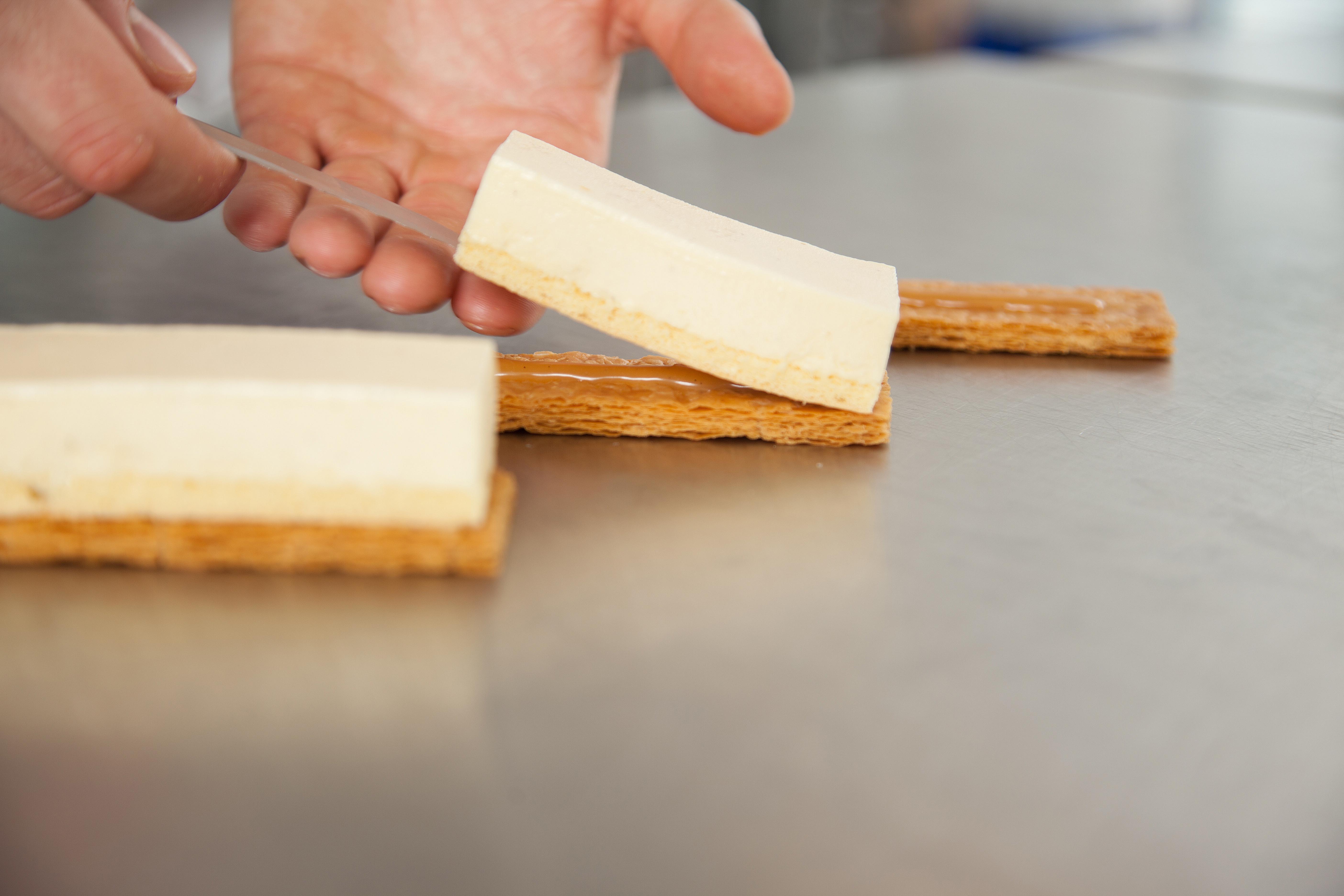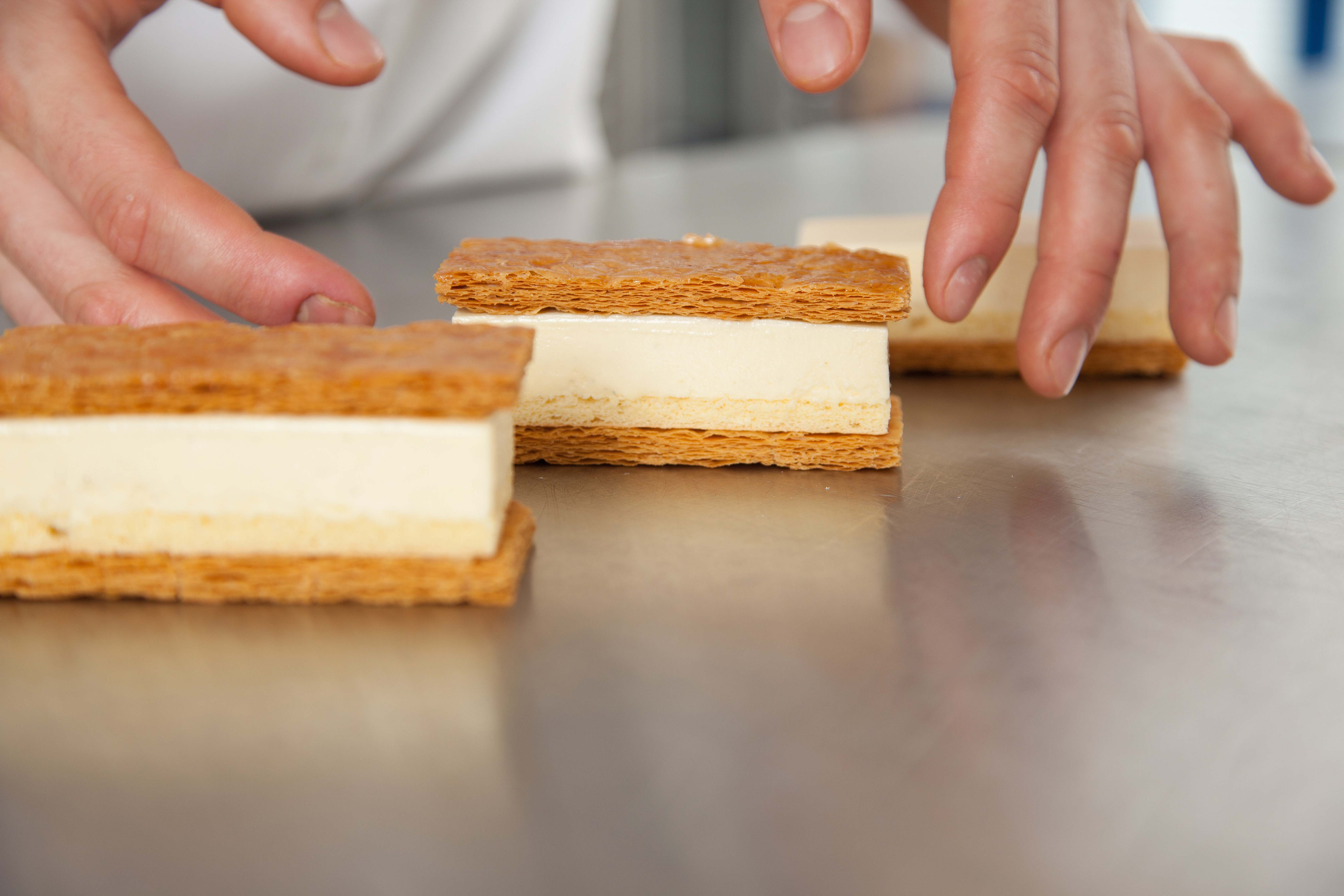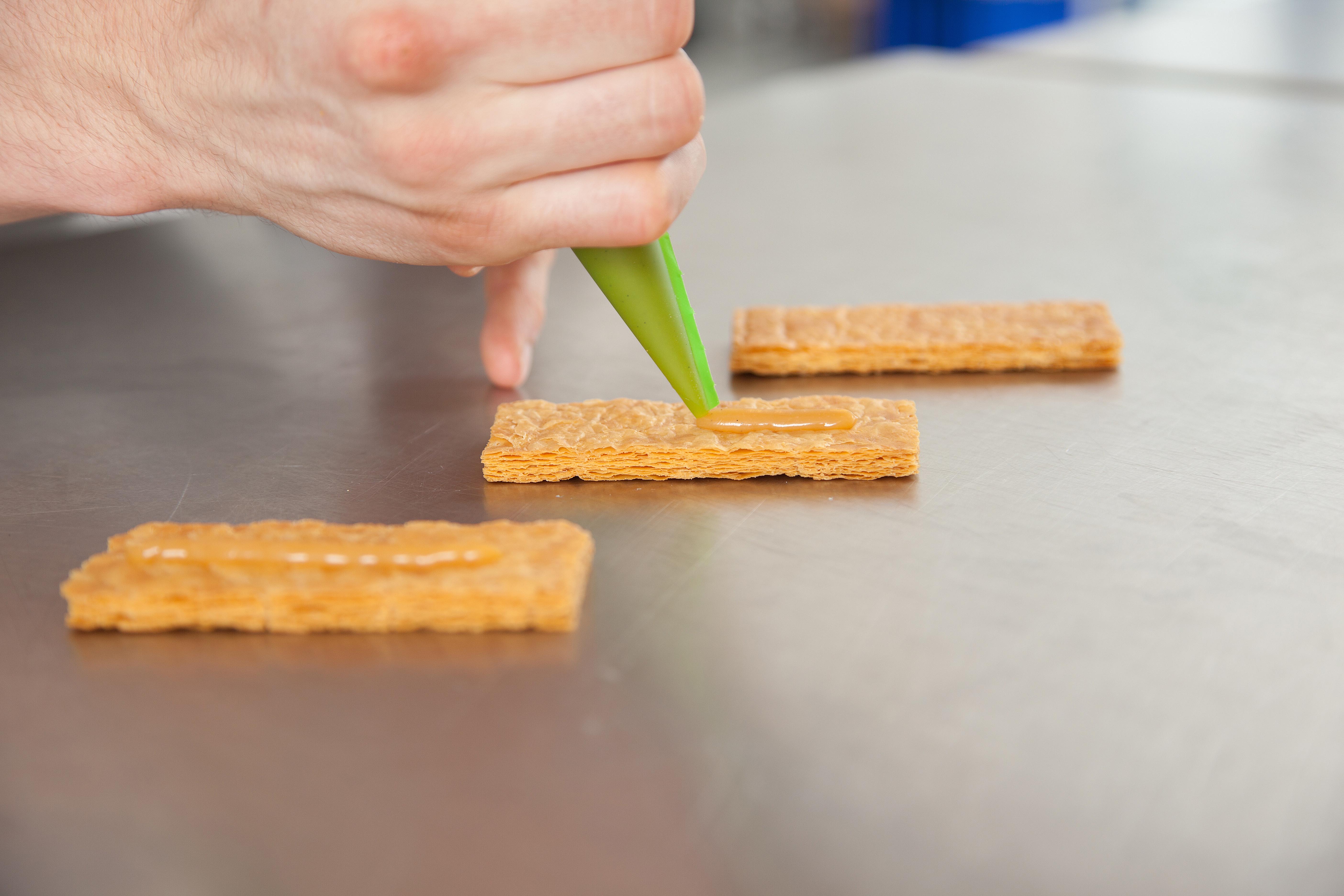 Rol het bladerdeeg uit tot 2,5 mm. Tussen platen (onder druk) bakken tot bijna gaar. Daarna bovenste plaat verwijderen en gaar bakken/nadrogen. Afmeting: 4 x 9 cm.