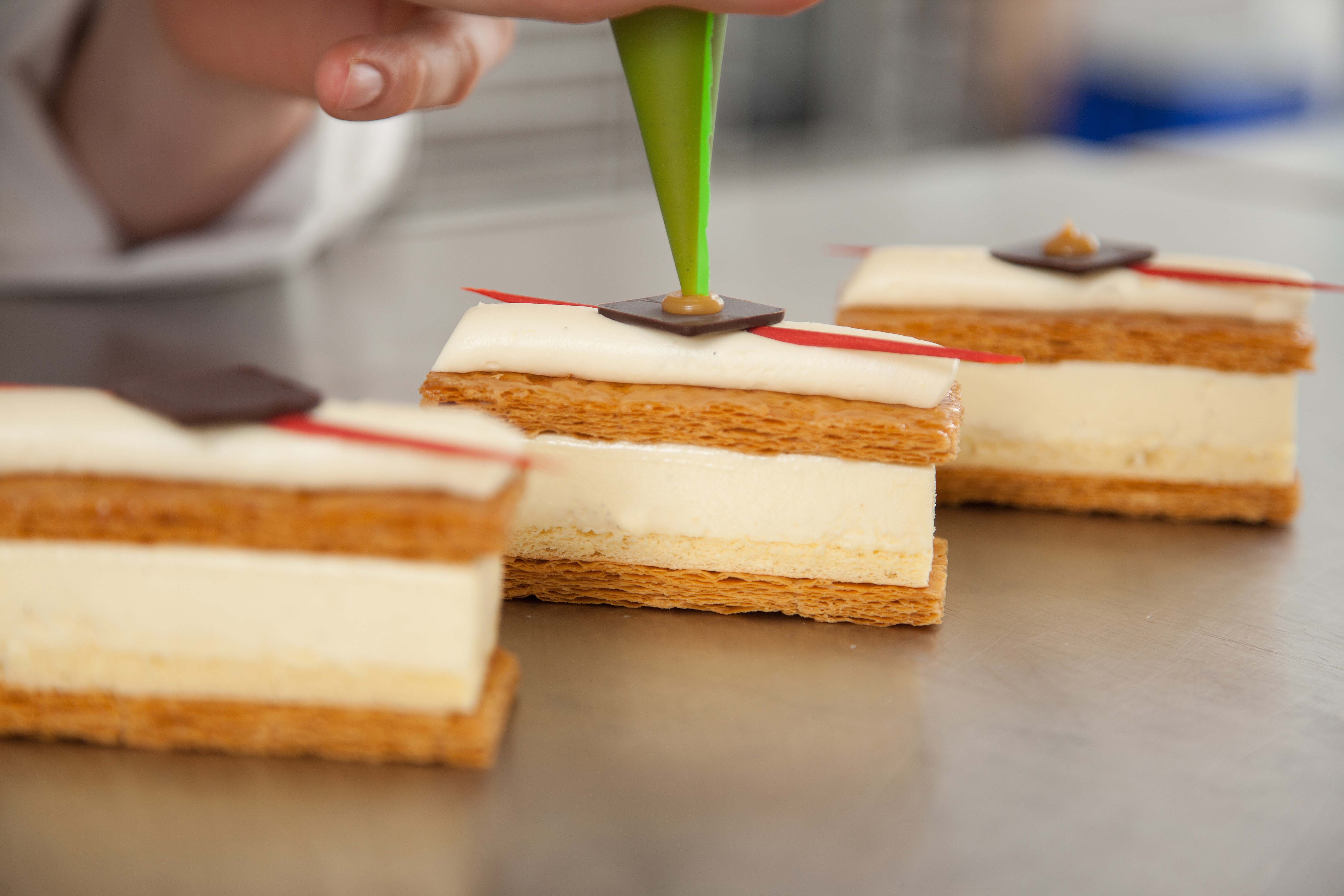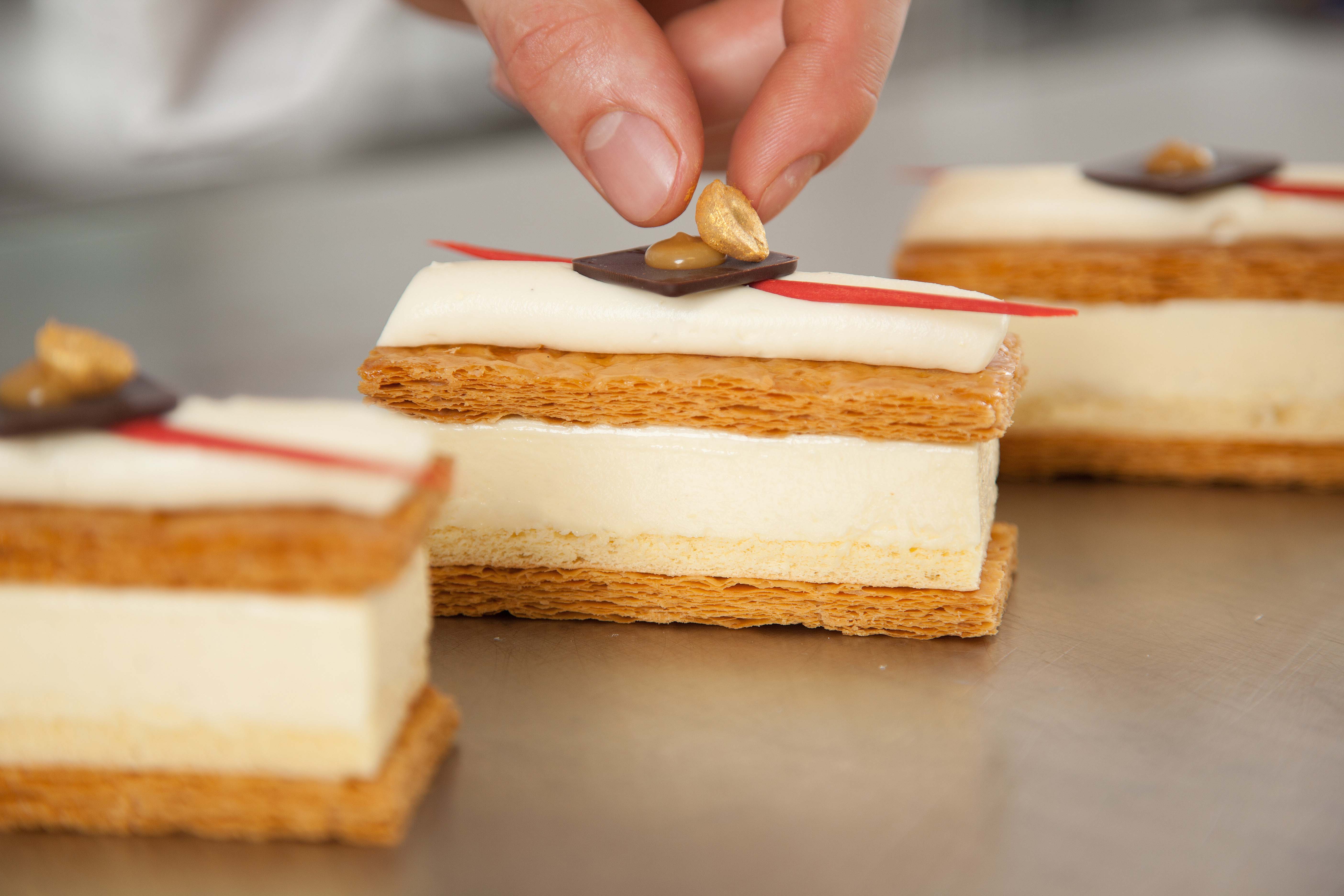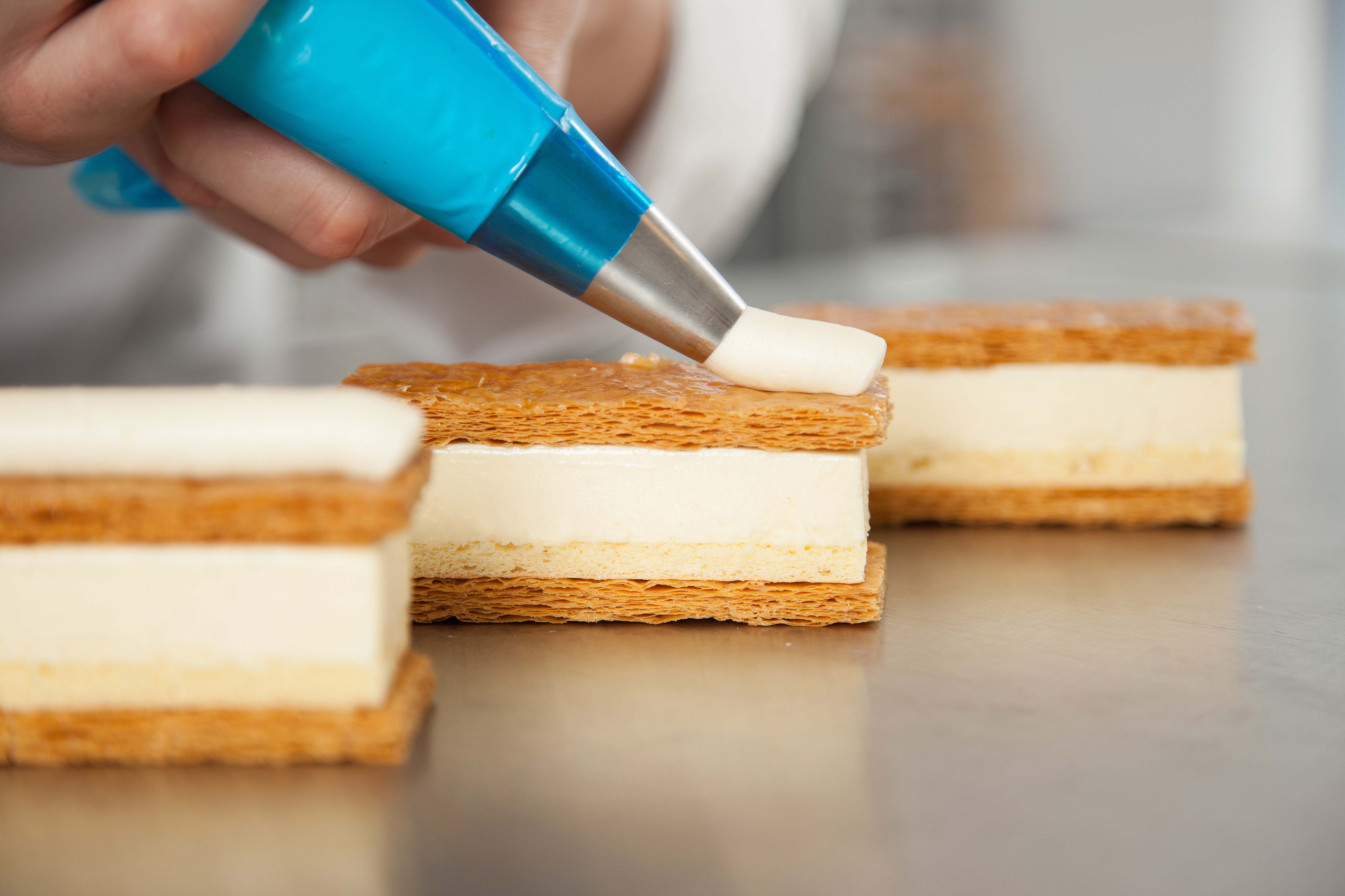Rol het bladerdeeg uit tot 2,5 mm. Tussen platen (onder druk) bakken tot bijna gaar. Daarna bovenste plaat verwijderen en gaar bakken/nadrogen. Afmeting: 4 x 9 cm.