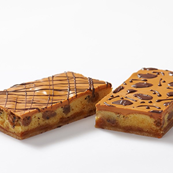 Maak de boter zalvig. Voeg vervolgens de Damco muffin/cupcakemix met het ei en het water toe en meng de massa gedurende 2 minuten met de vlinder in de tweede versnelling. Verdeel 1.000 g van het beslag uit over de plaat. Spuit vervolgens de Frucaps caramelvulling met een spuitzak over het beslag en daarna de andere helft van de Damco muffin/cupcakemix (1.500 g). Verdeel als laatste de Cookie Dough Chunks over het beslag en bak af.