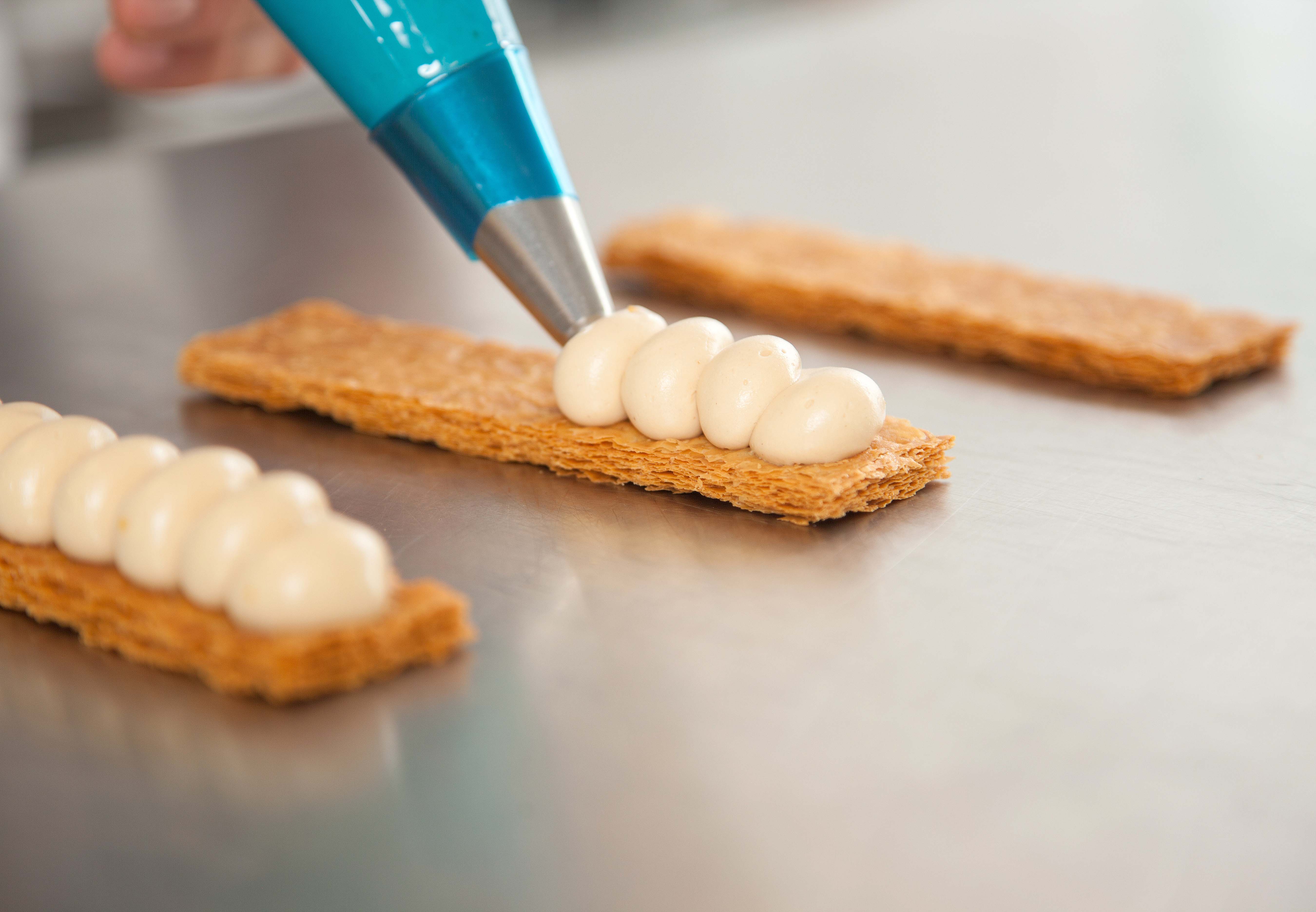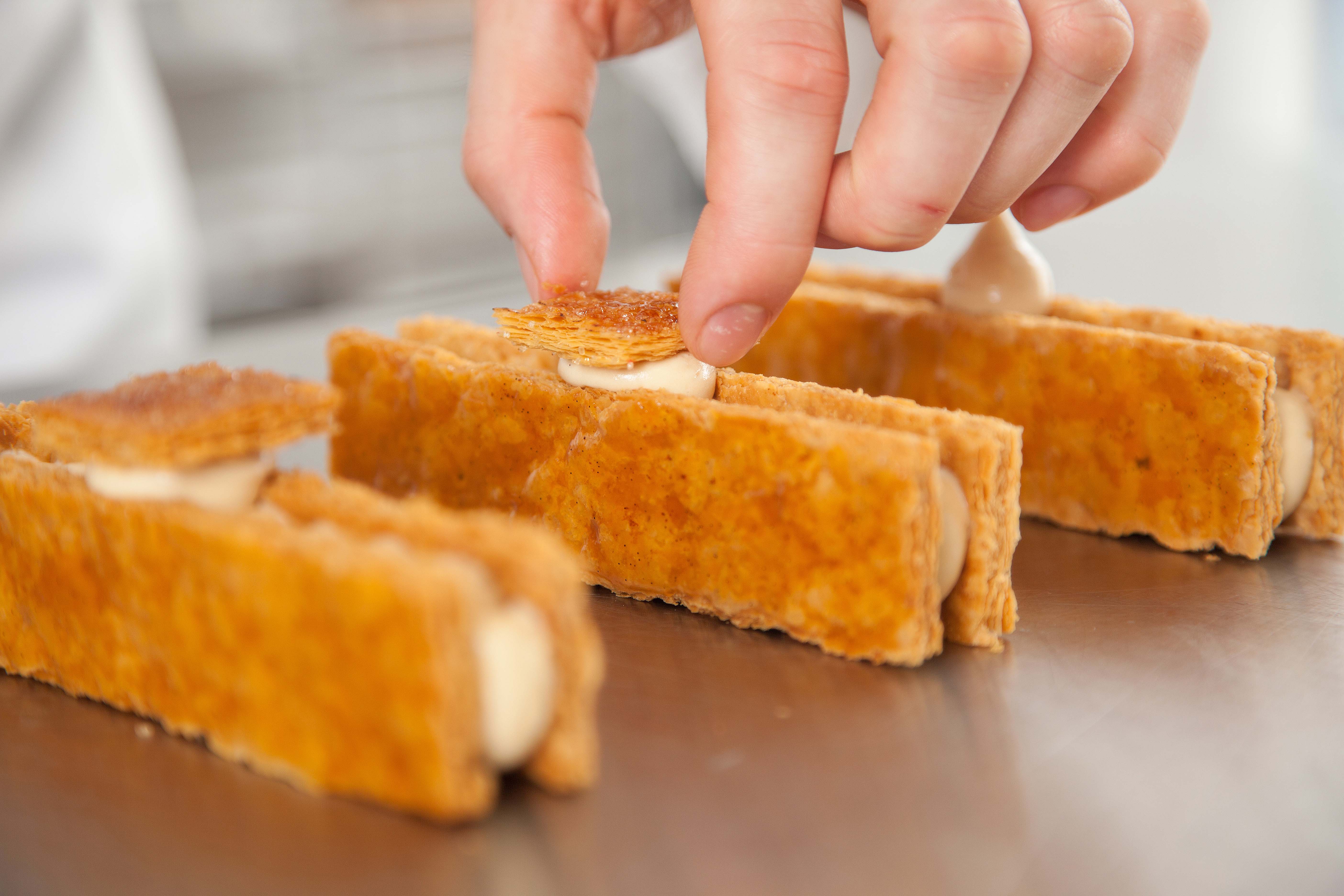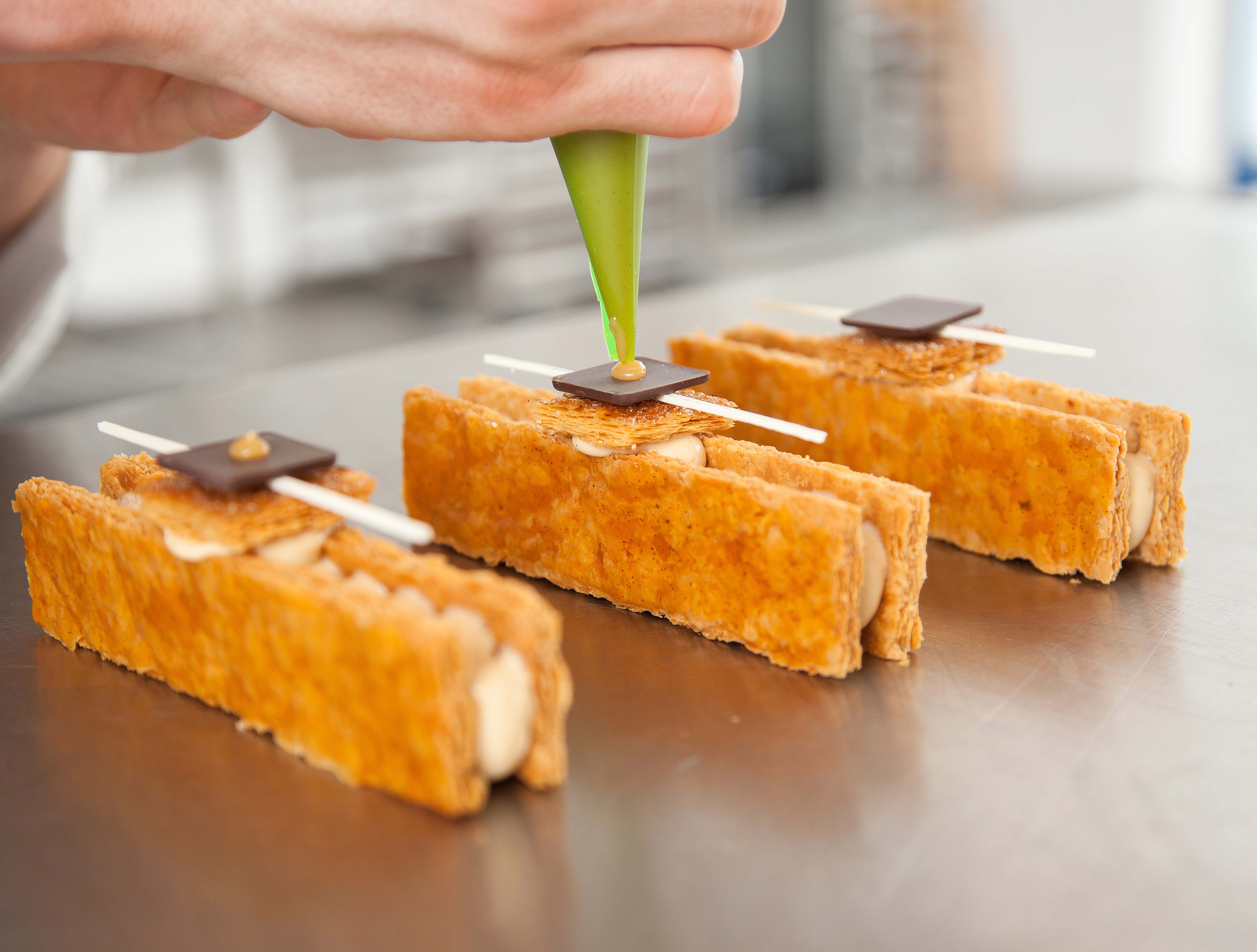 Rol het bladerdeeg uit tot 2,5 mm. Tussen platen (onder druk) bakken tot bijna gaar. Daarna bovenste plaat verwijderen en gaar bakken/nadrogen. Afmeting: 12,5 x 3,5 en 3,5 x 3,5 cm.