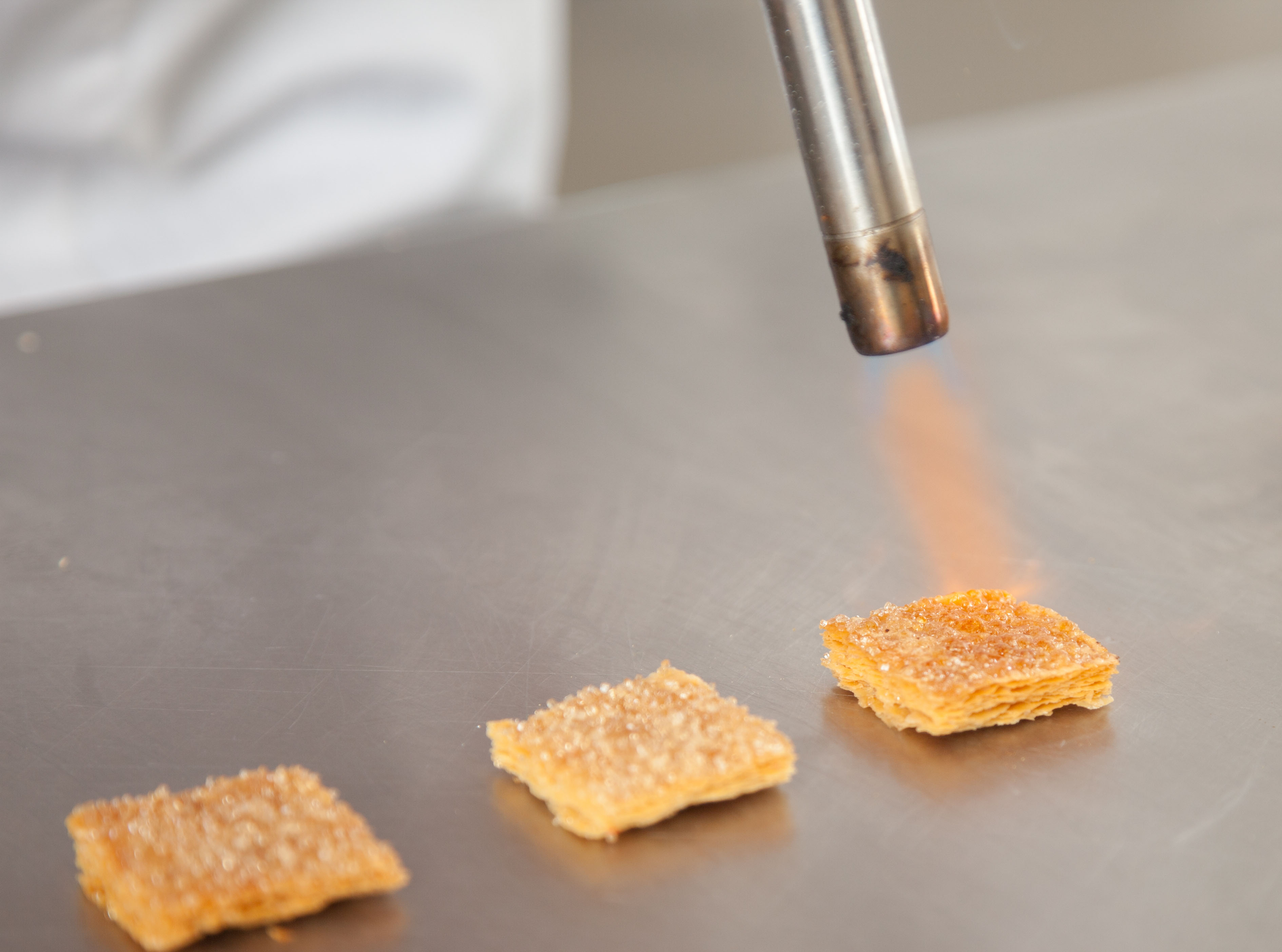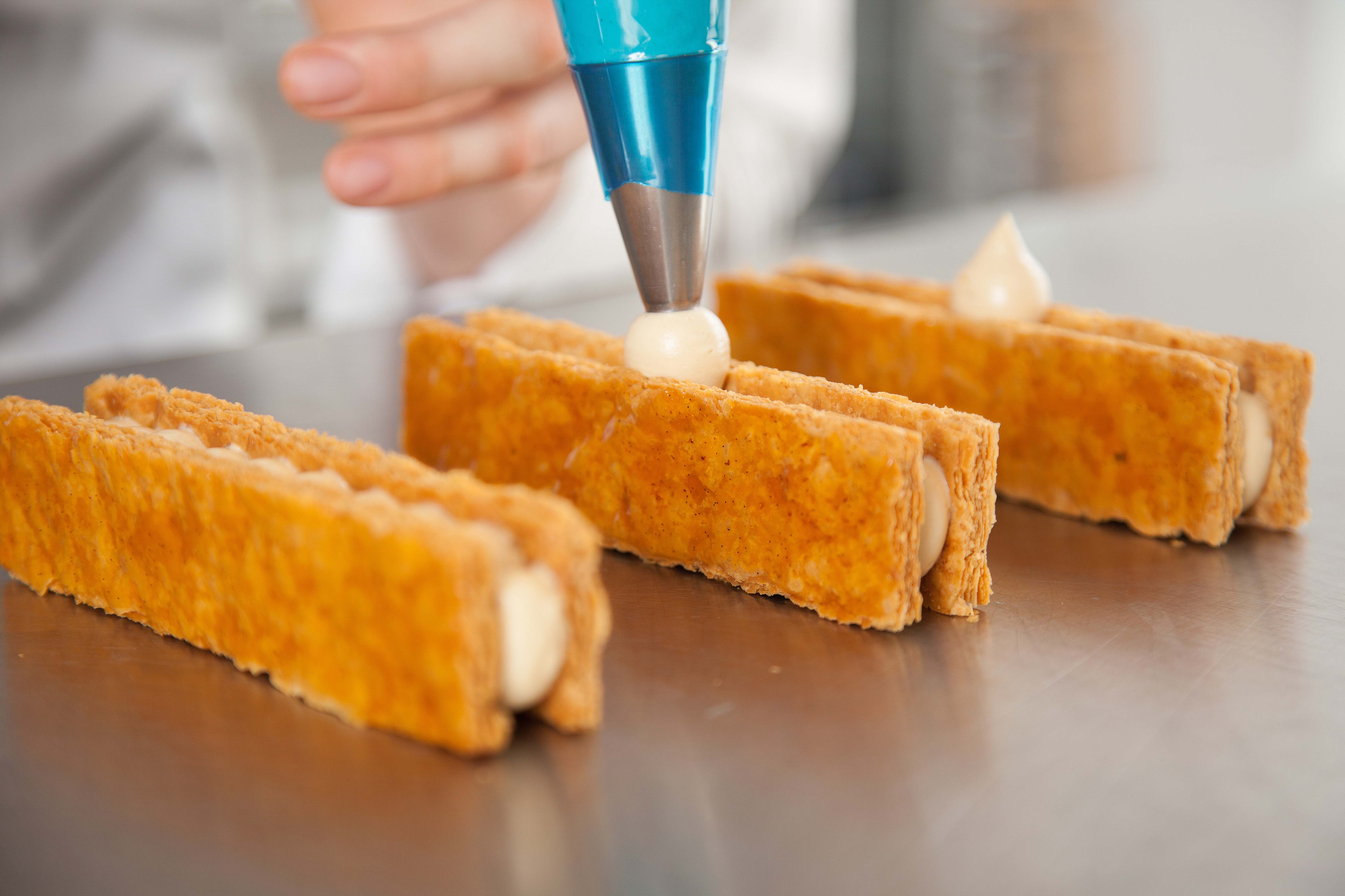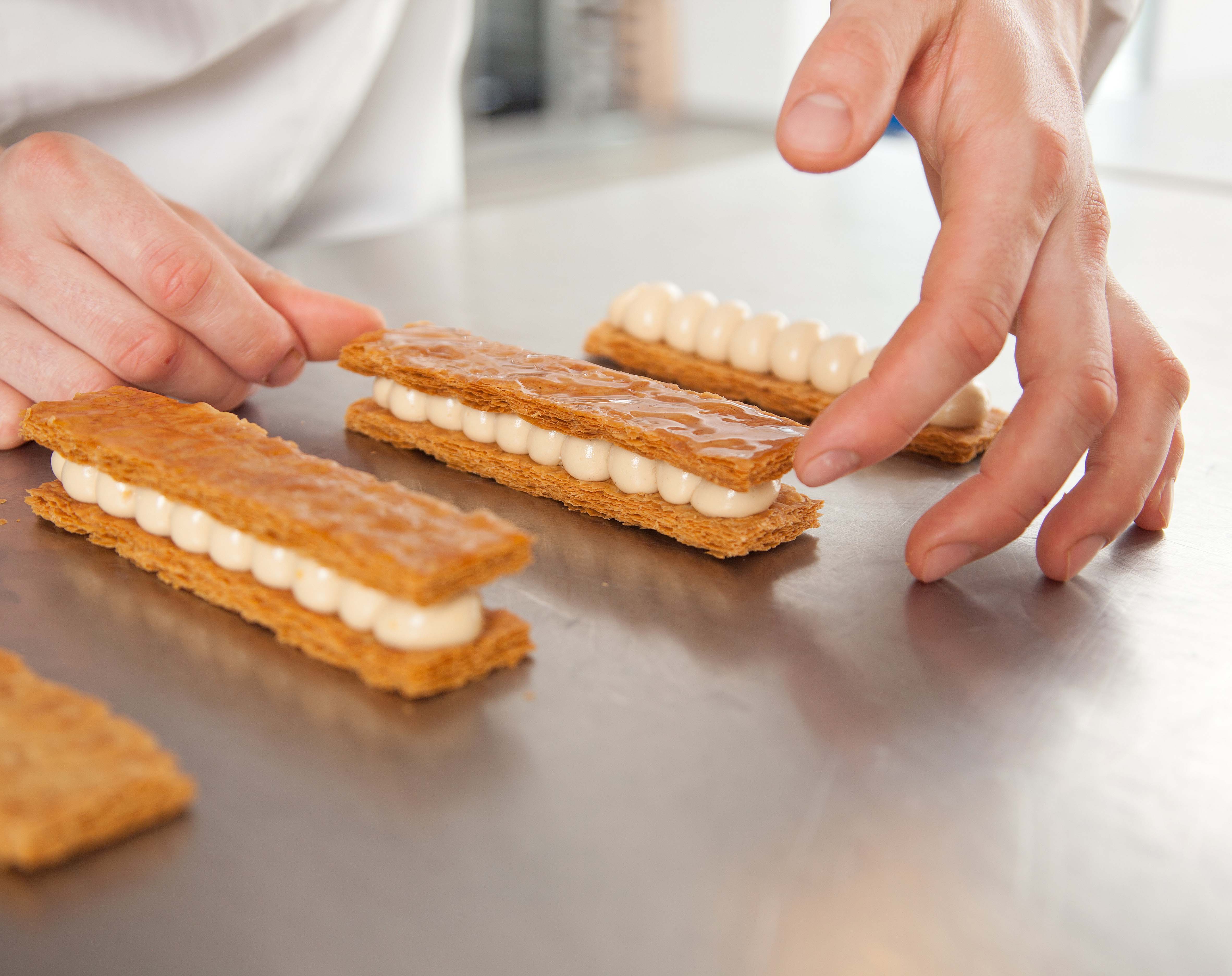 Rol het bladerdeeg uit tot 2,5 mm. Tussen platen (onder druk) bakken tot bijna gaar. Daarna bovenste plaat verwijderen en gaar bakken/nadrogen. Afmeting: 12,5 x 3,5 en 3,5 x 3,5 cm.