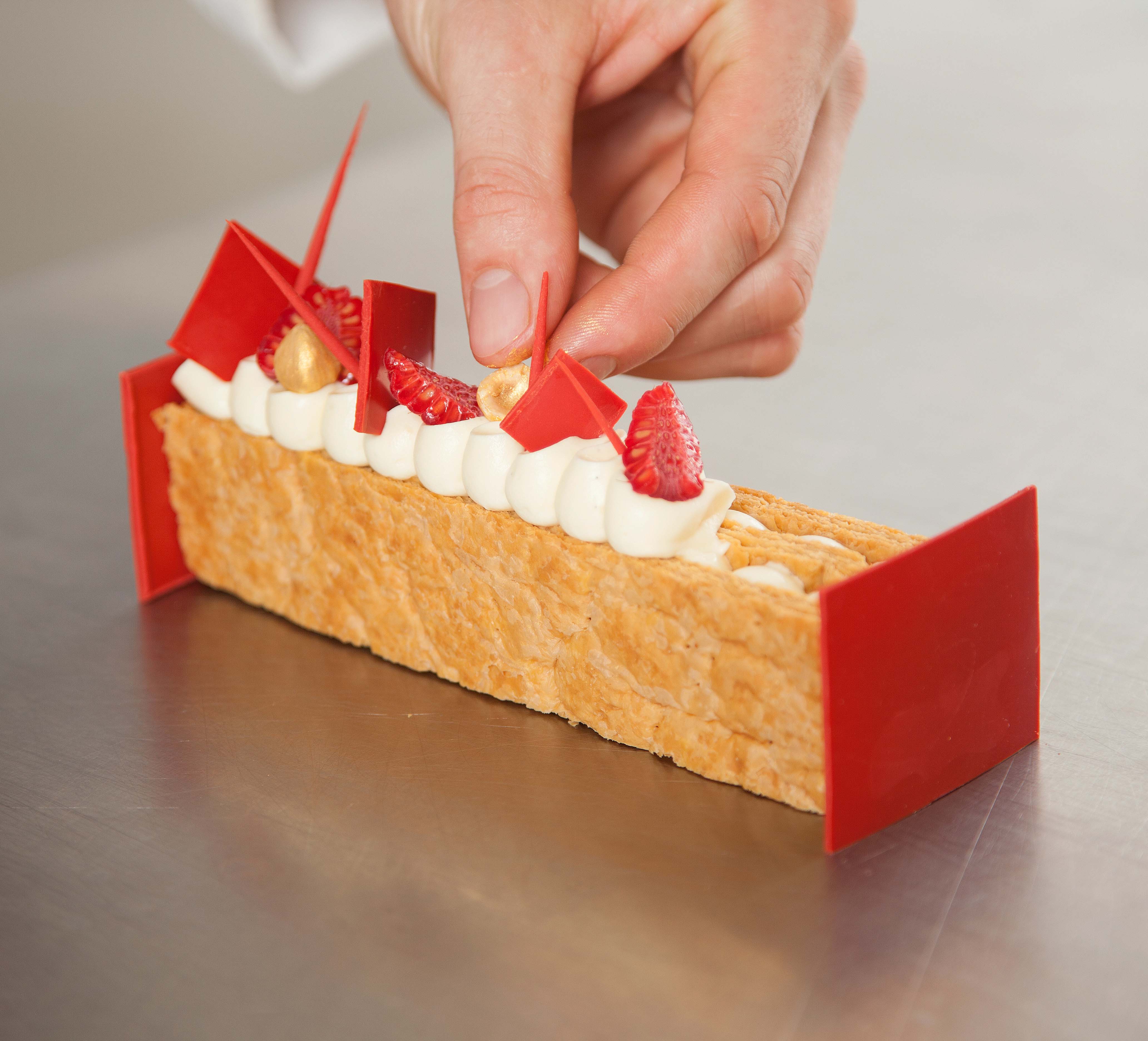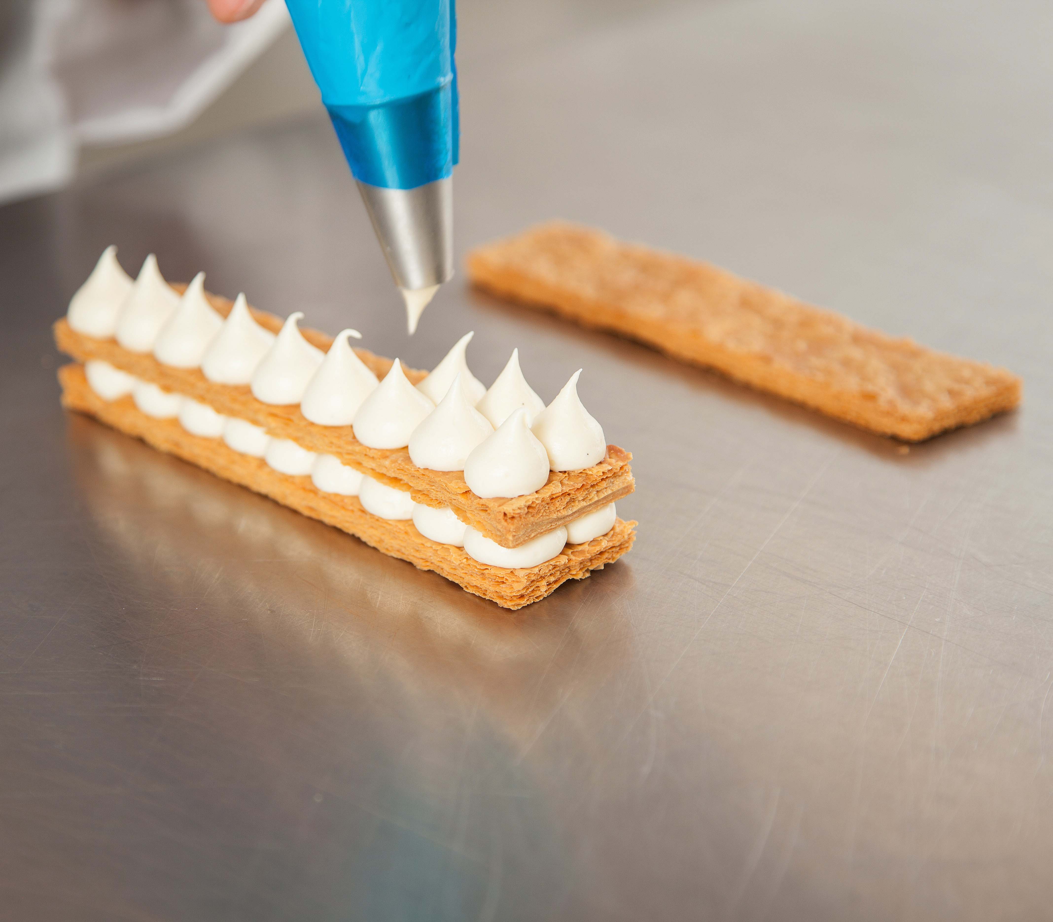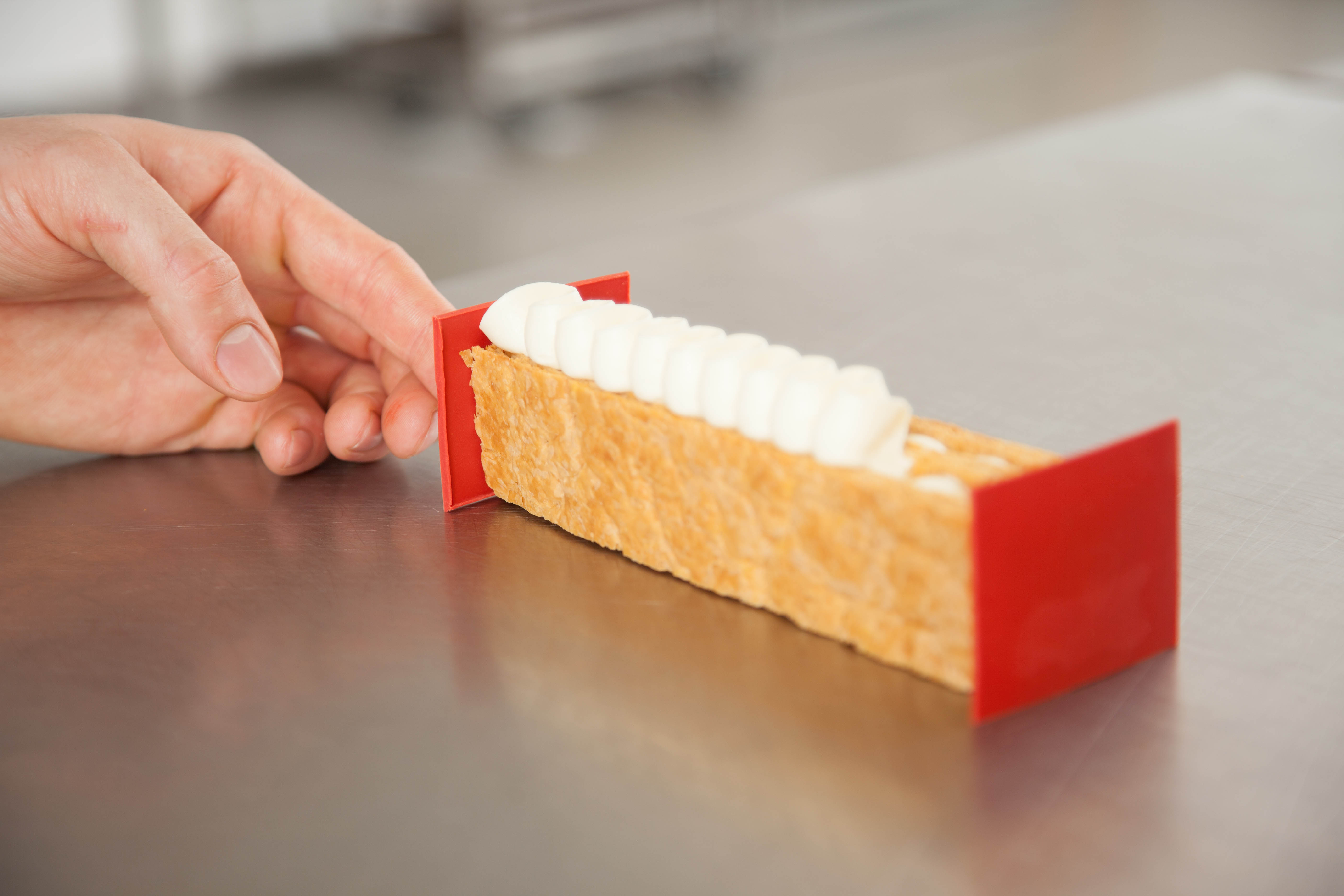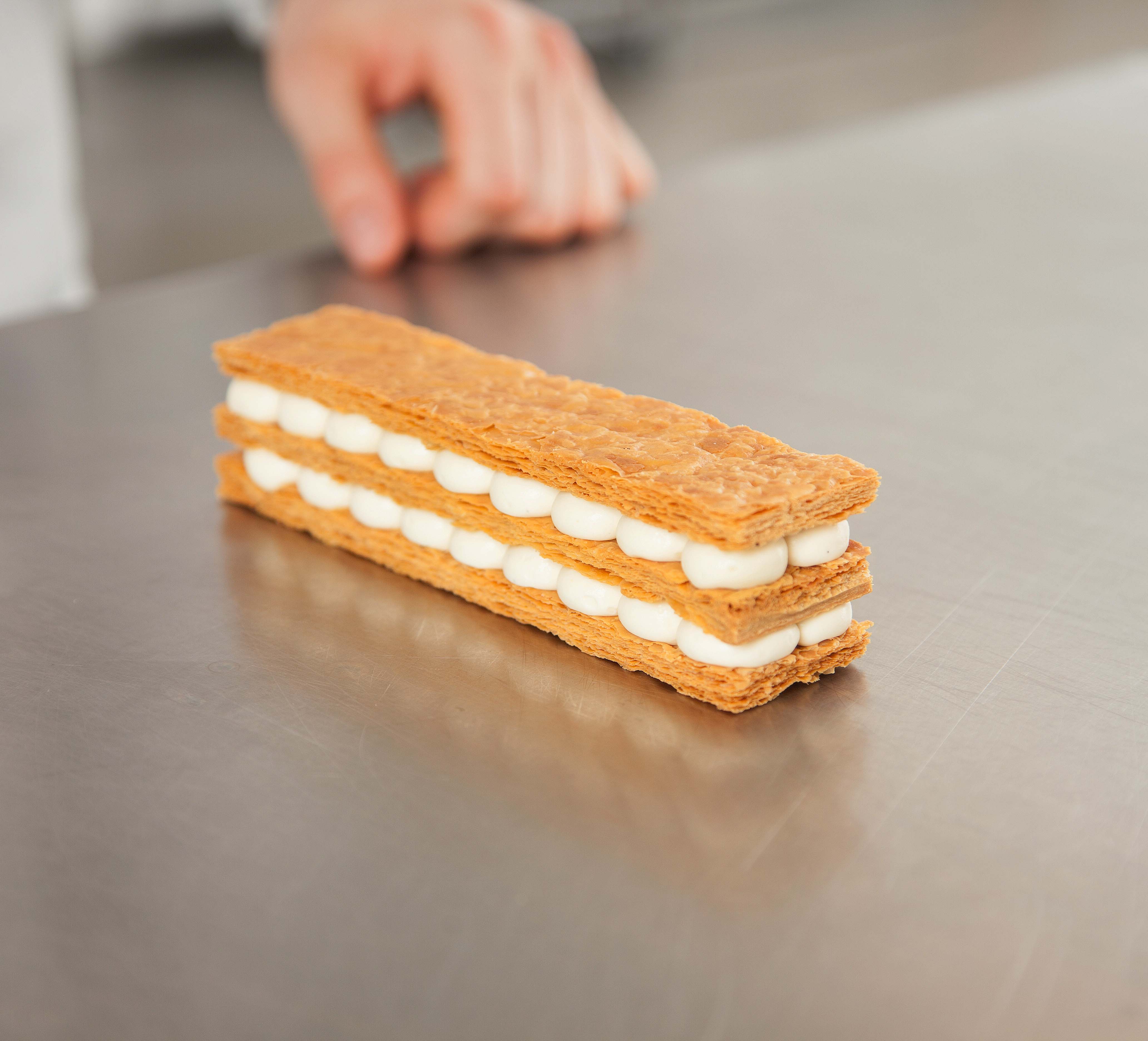 Rol het bladerdeeg uit tot 2,5 mm. Tussen platen (onder druk) bakken tot bijna gaar. Daarna bovenste plaat verwijderen en gaar bakken/nadrogen. Afmeting: 19 x 4,5 cm.