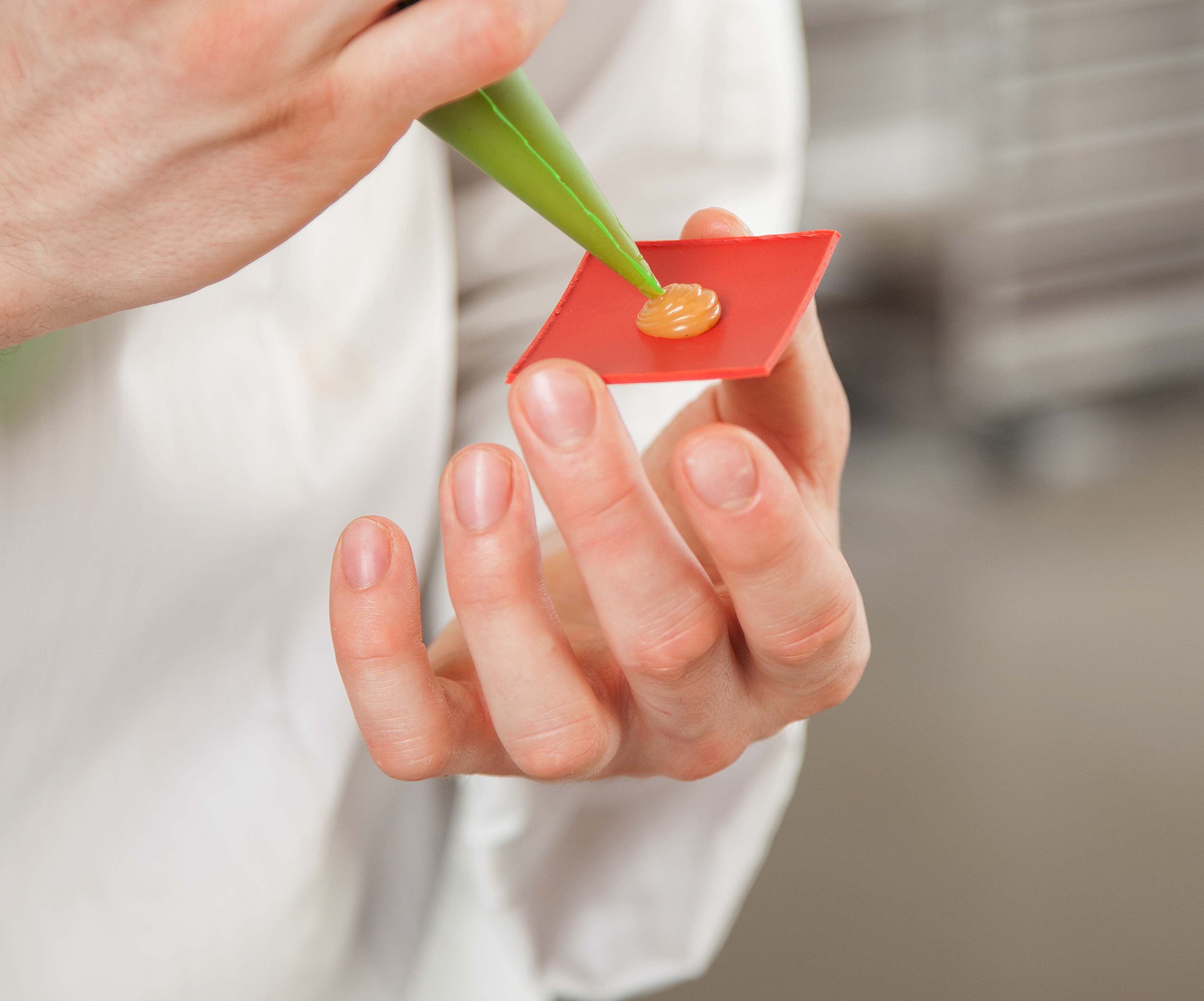Chocolade verwarmen tot 45°C, terugkoelen tot 29°C. Gladstrijken tot 2 mm en snijden naar wens.
