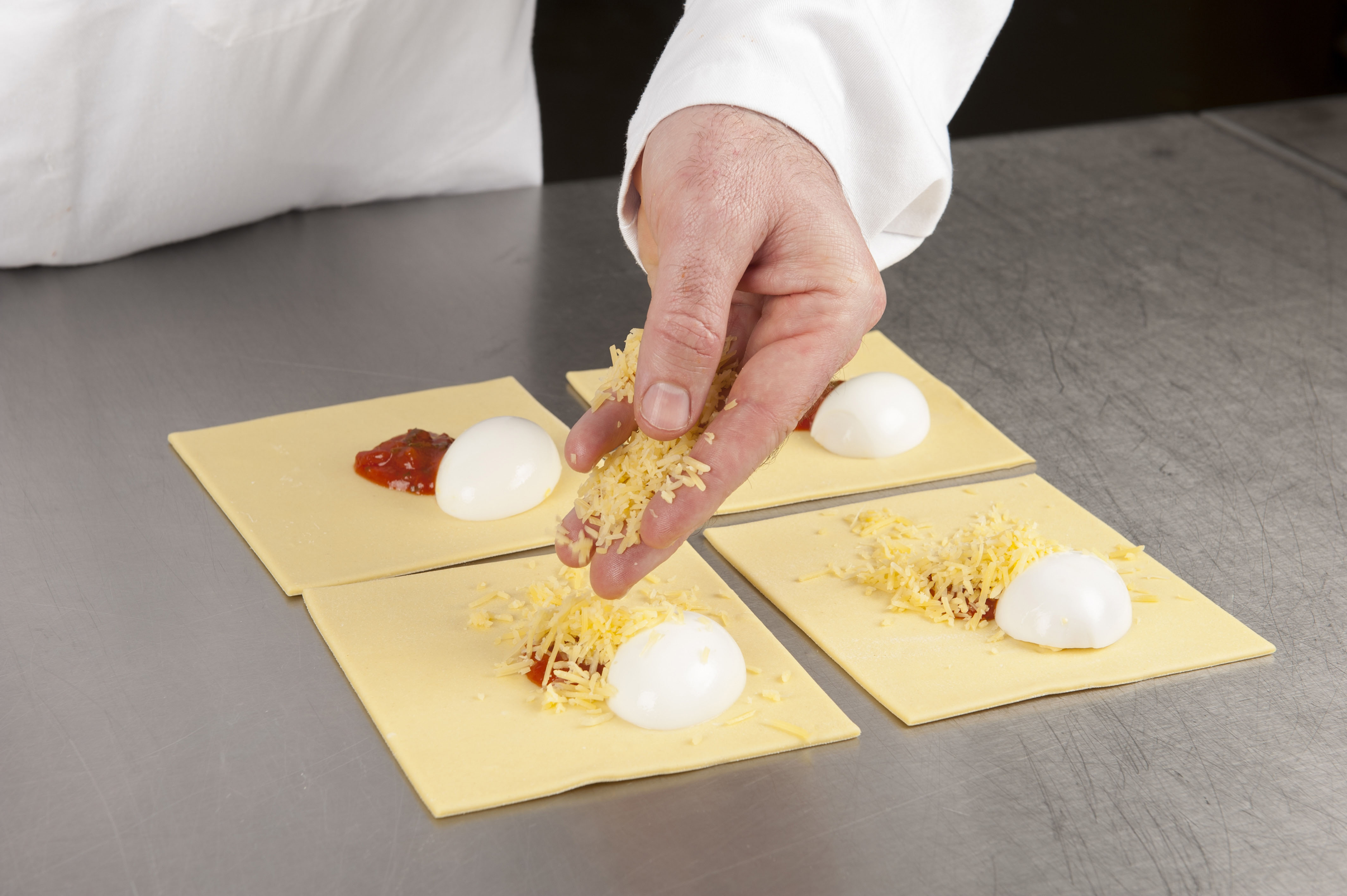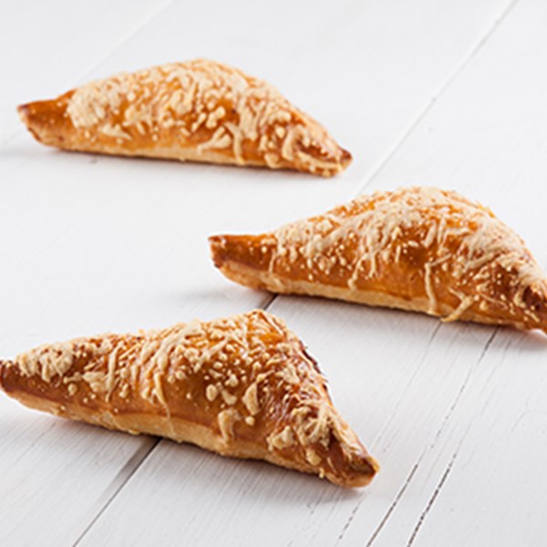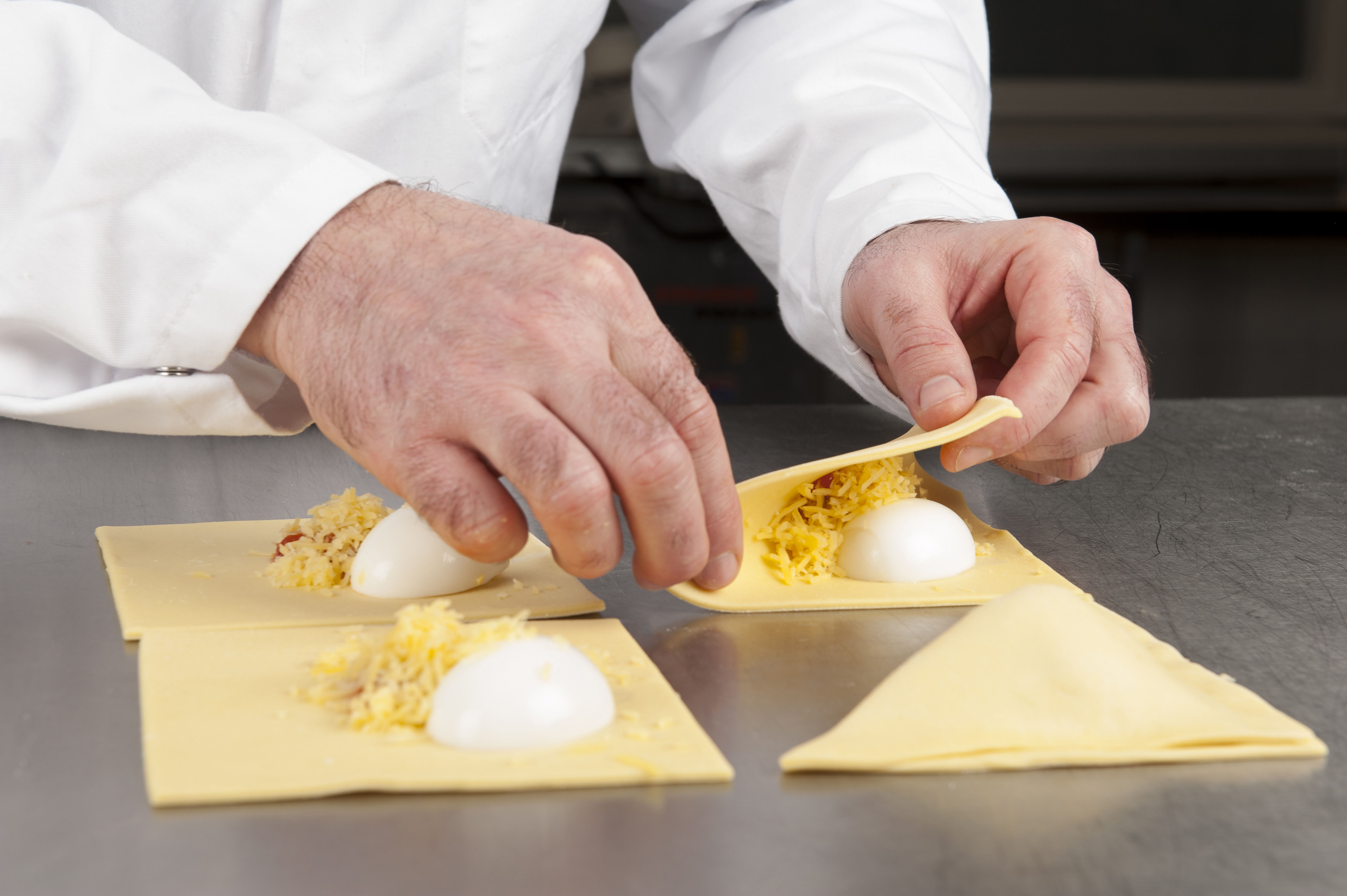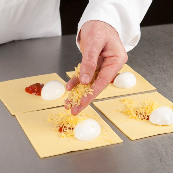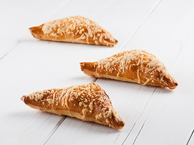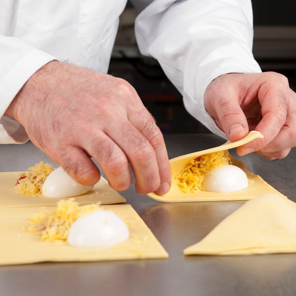 Bladerdeeg uitrollen tot 2,5 mm. Snijden in vierkanten van 14 cm. Maak de plakjes licht vochtig aan de randen. Vulling plaatsen, halfgekookt ei en geraspte kaas. Dichtvouwen, aandrukken en strijken met water. Bestrooi met belegen kaas en eventueel groene gedroogde kruiden.