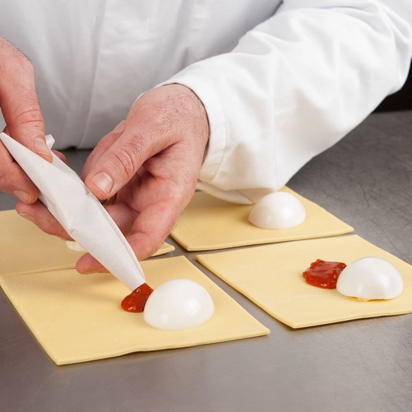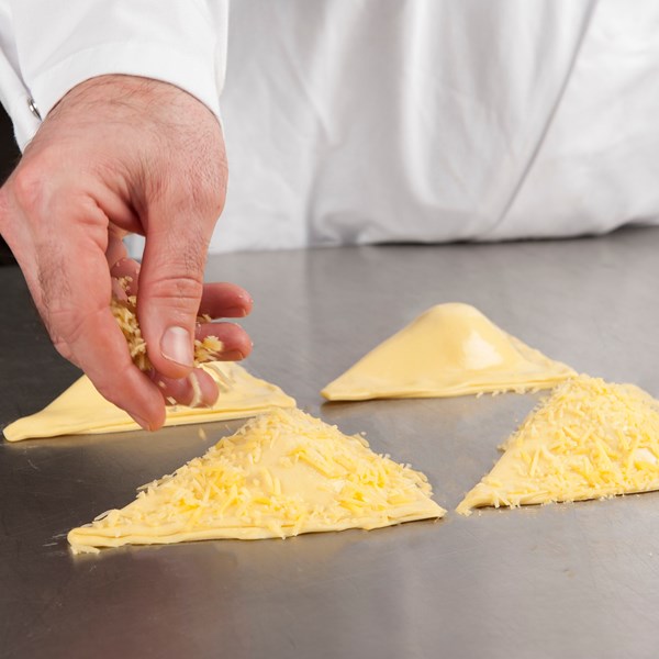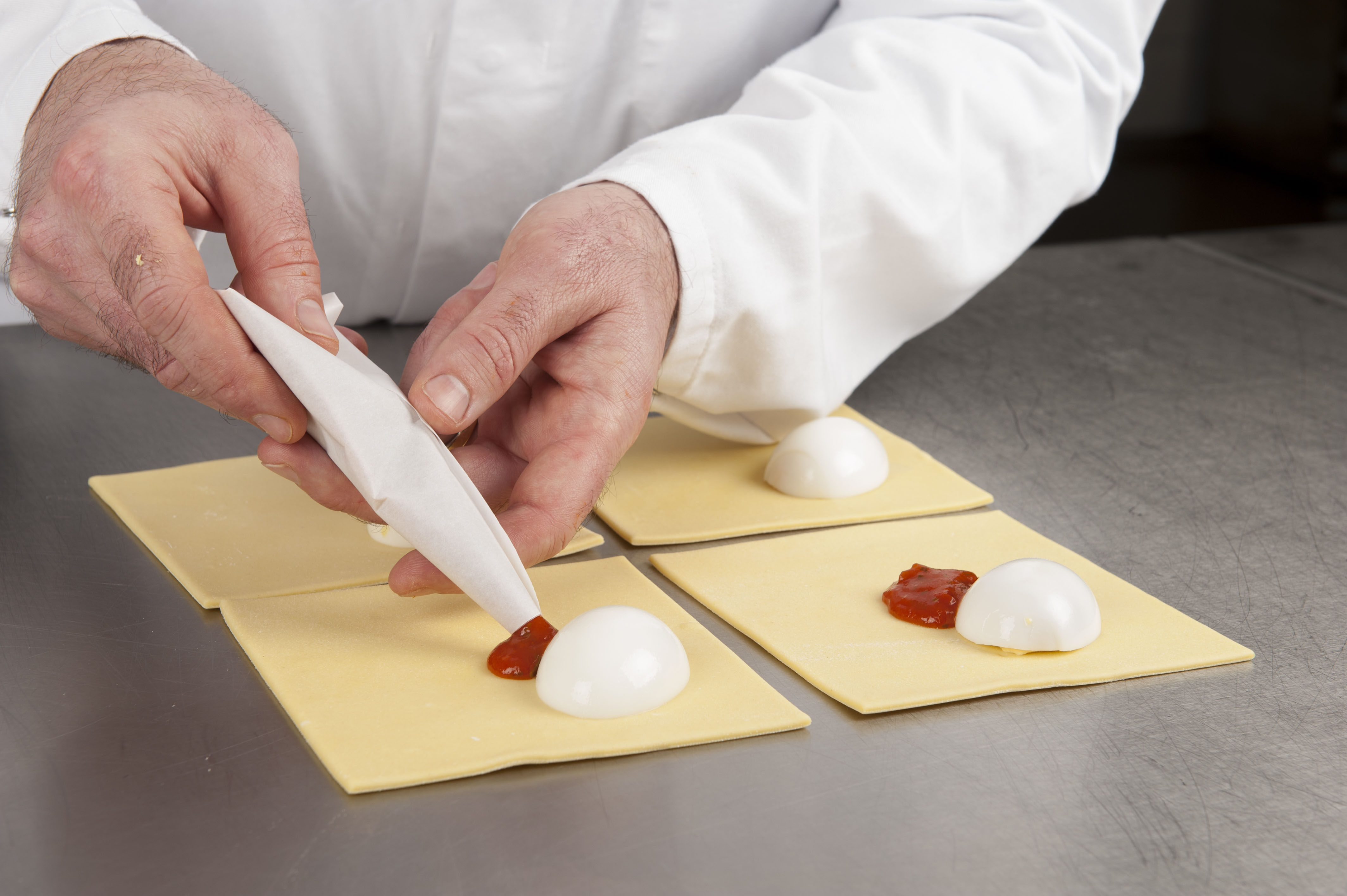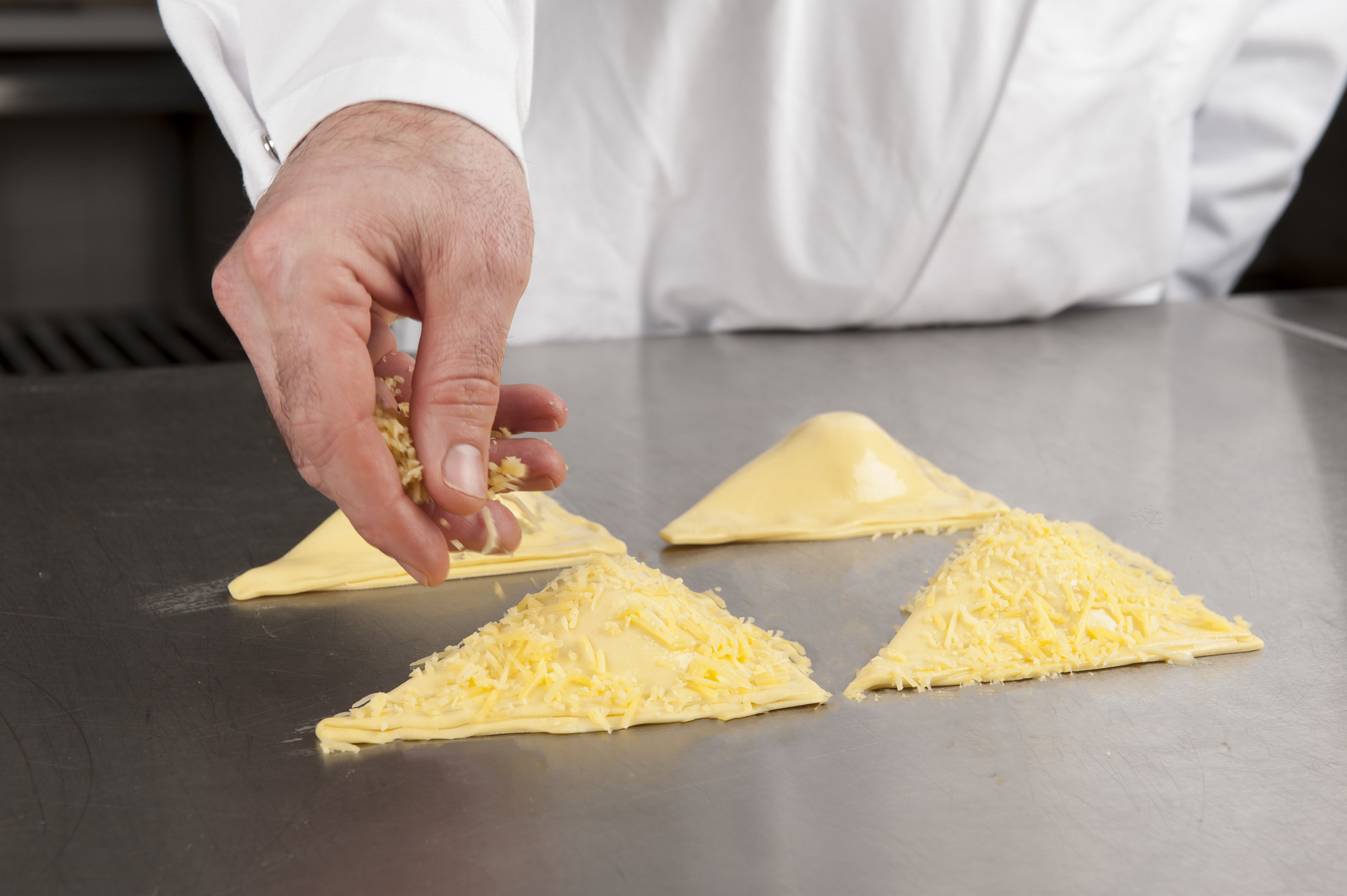 Bladerdeeg uitrollen tot 2,5 mm. Snijden in vierkanten van 14 cm. Maak de plakjes licht vochtig aan de randen. Vulling plaatsen, halfgekookt ei en geraspte kaas. Dichtvouwen, aandrukken en strijken met water. Bestrooi met belegen kaas en eventueel groene gedroogde kruiden.